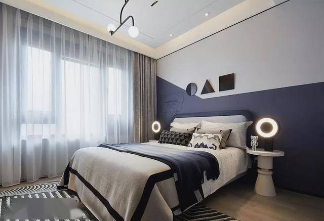 ▲儿童房的床头墙以蓝色+灰色的拼色墙设计,挂上圆形、三角形与正方形的小装饰,搭配灰黑配的地毯与床单,两侧优雅的床头柜上布置环形台灯,带来一种安静优雅的冷静氛围感。