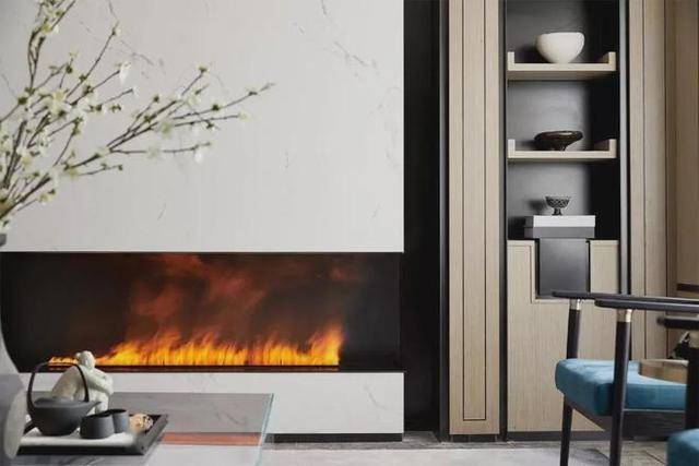 ▲客厅布置没有以电视墙为中心,而是以待客休闲为住,靠墙布置沙发,靠窗布置沙发椅,沙发墙后挂一幅墨色的装饰画,整个空间地面铺上灰墨色的地毯,带来一种简约端庄的高级感。“电视墙”以对称的设计,中间加入壁炉与石材背景墙,两侧是对称的展示架,摆上端庄的装饰品,也让空间显得更加儒雅高级。