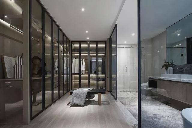 ▲衣帽间与主人卫生间连通的设计,大大的衣帽间采取玻璃门的衣柜设计,衣服收纳防尘又方便查找,设在卫生间旁的衣帽间,淋浴后也能快速更衣,实用优雅而情趣。