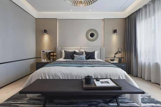 ▲卧室灰色床头墙两侧是卡其色的硬包,两侧加入壁灯,中间加入暗藏灯带,让床头墙层次感丰富、明亮大方。布置素雅的皮艺床,床尾一张深色的床尾凳,使得卧室档次而舒适。