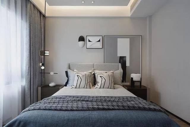 ▲父母房以灰色的墙面空间,床头墙挂靠上黑白灰的装饰画,搭配灰色布艺床,蓝灰配的床单布置,整个空间显得简雅舒适。