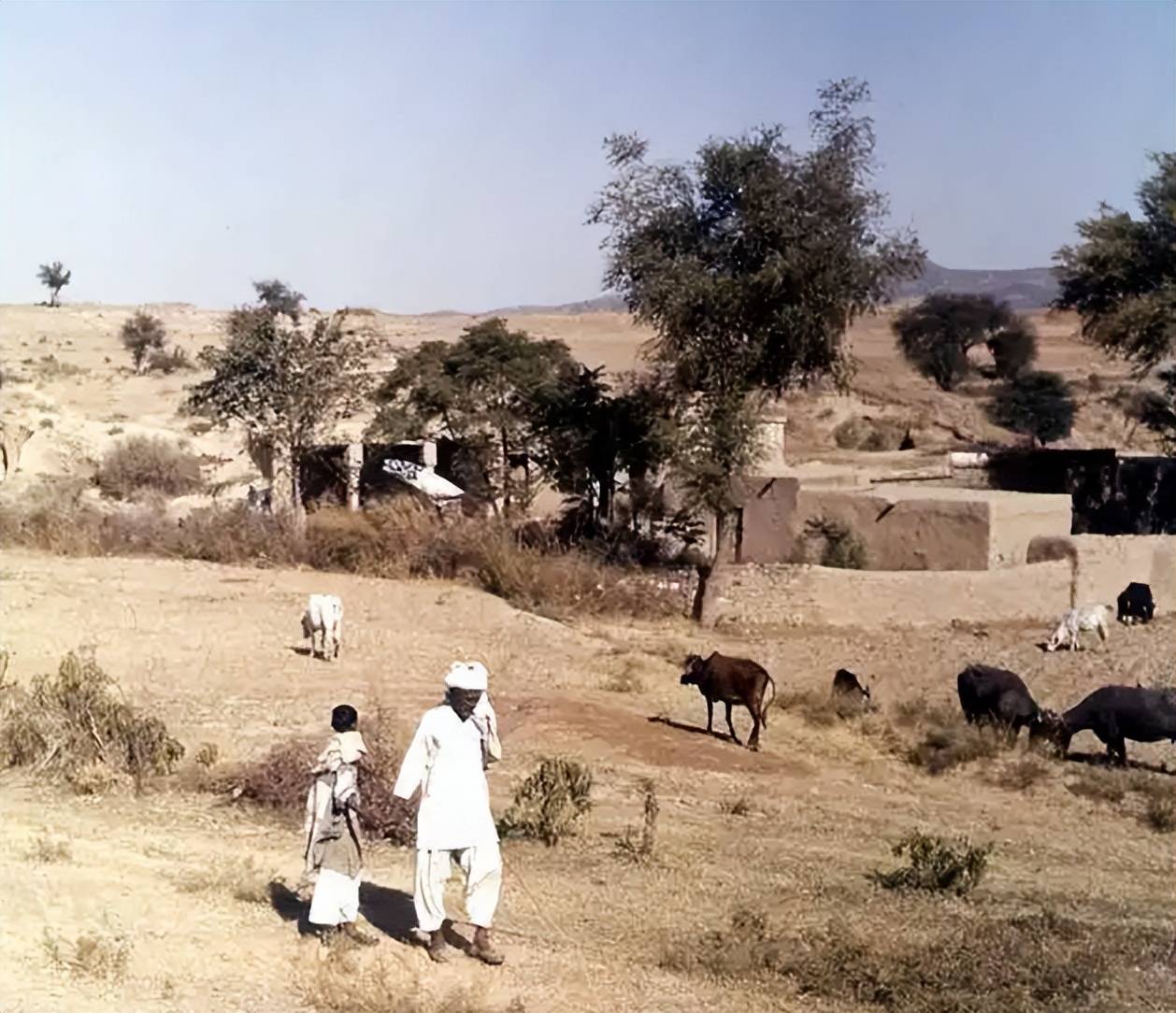 🔹 图片14:土坯建筑、牛群、白色服饰人物