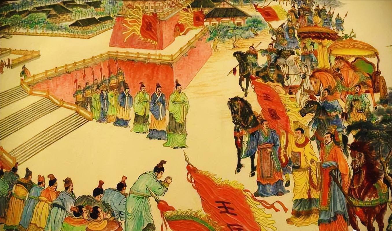 | 图片5 | 城墙下人群跪拜,举红旗有黑色文字,车马列队 | 极可能是朝贡队伍入城场景,“红旗下黑字”或为国书标识 |