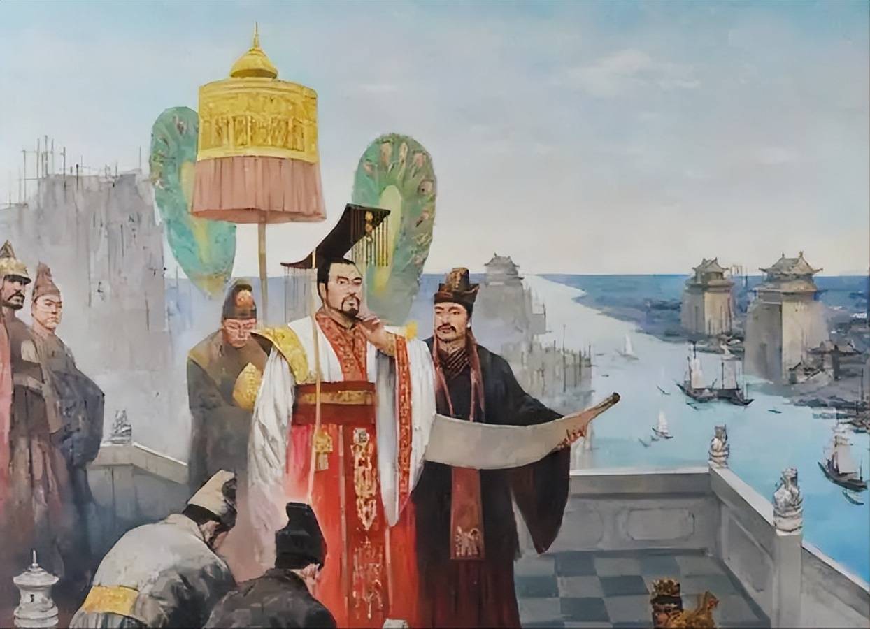 | 图片4 | 帝王冠冕者坐华盖之下,侍从撑伞,有人献卷轴 | 典型的“藩王来朝”图式,象征权力与臣服 |