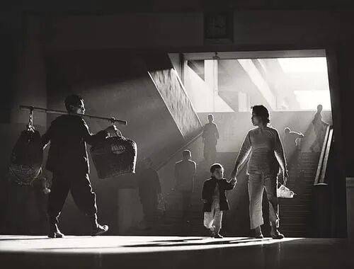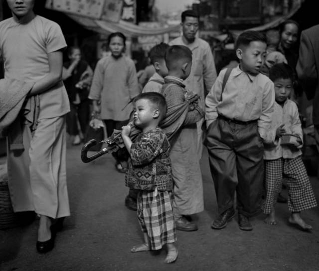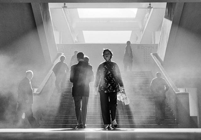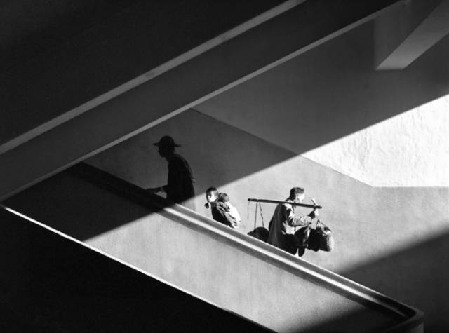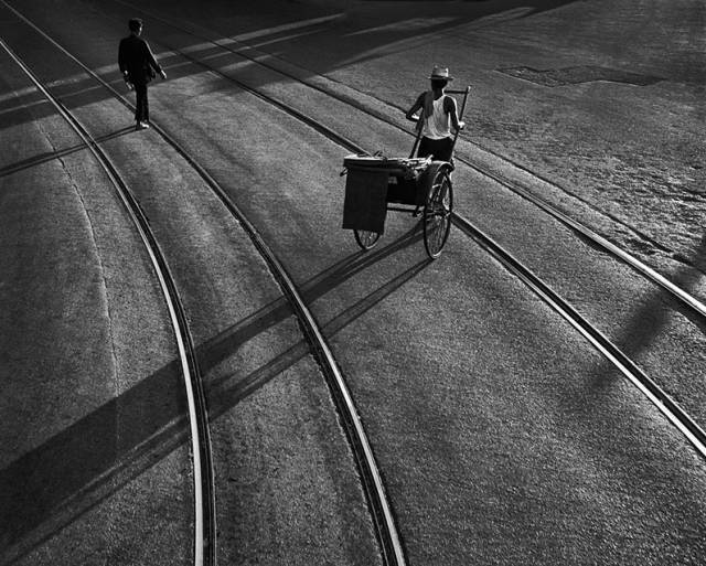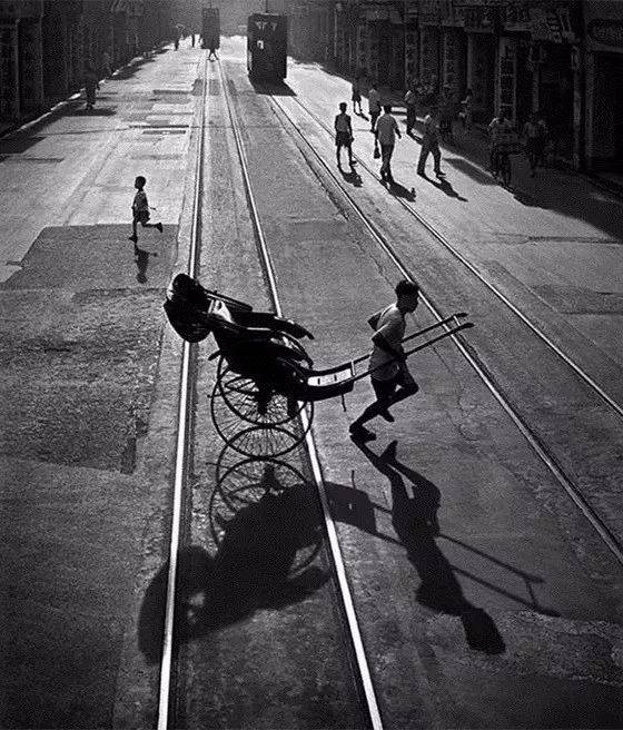 然而,真正让何藩这个名字超脱一时一地,升华为文化符号的,是他手持相机时所创造的世界。自上世纪五十年代起,他的镜头便如诗人的眼,深情而敏锐地凝视着香港的街头巷尾。楼梯的几何切割,电车轨道延伸的线条,市集蒸腾的雾气,以及在其中匆匆或停滞的芸芸众生……这些日常景象,在他匠心独运的构图、精妙绝伦的光影掌控下,被提炼为充满张力与哲思的视觉诗篇。他深受布列松“决定性瞬间”理论的影响,但并未止步于模仿。何藩的镜头里,东方的诗意与禅意潺潺流淌:那逆光中勾勒出的挑担者剪影,是劳作的颂歌;那窗格与光影交织成的抽象画,是时光的凝固;那雨中朦胧的旗袍身影,是欲说还休的东方情致。他将香港的喧嚣、拥挤与生命力,转化为了静谧、深邃而永恒的美学秩序,因而被誉为“东方布列松”——这不仅是技艺上的比拟,更是对其开创东方街头摄影美学范式之贡献的最高礼赞。