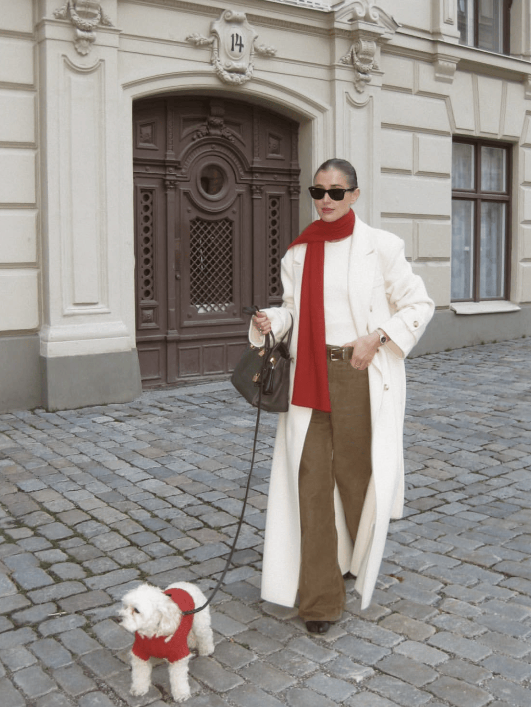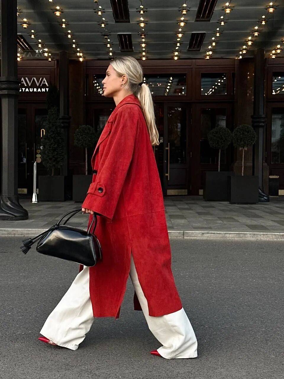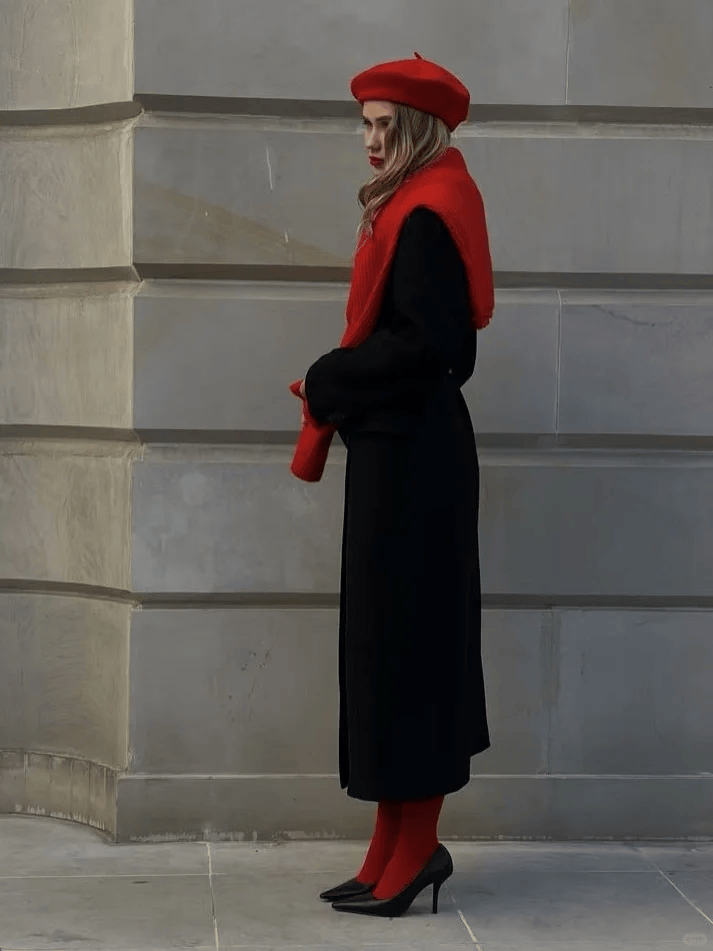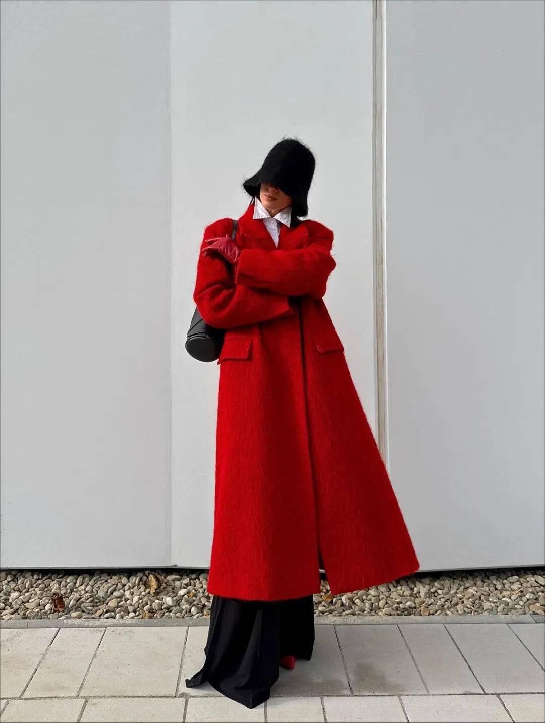 穿搭建议:选择一件彩色羊绒大衣作为视觉锚点,内搭保持中性色,让色彩成为叙事主角而非杂乱拼贴。