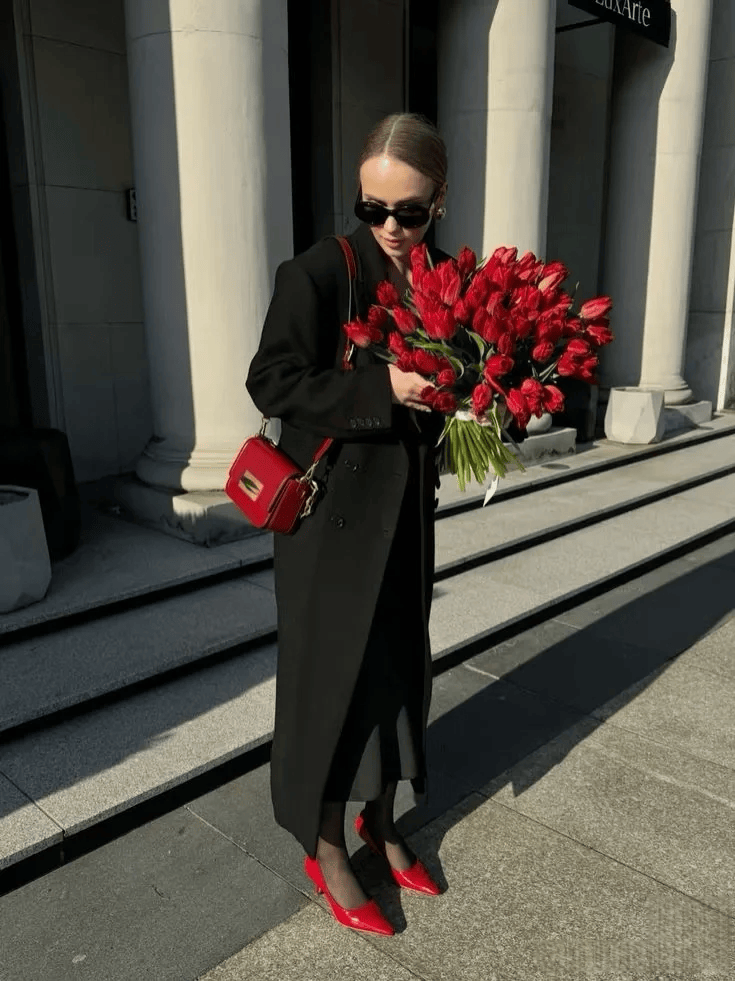 复古名伶:借鉴1950年代廓形,收腰连衣裙+珍珠项链+玛丽珍鞋,搭配红色唇膏,致敬经典圣诞电影中的女主角。