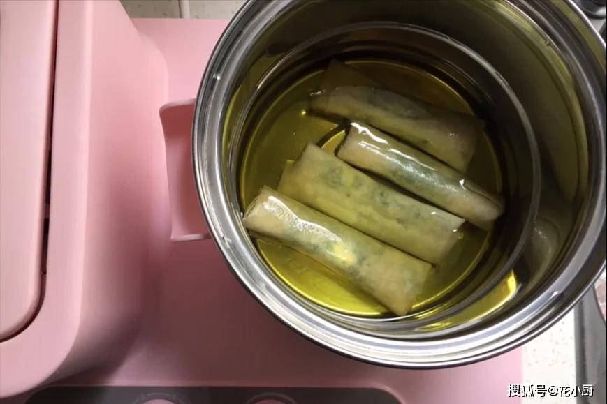 5、包好春卷之后,就可以开始炸啦。在锅里倒上足够的油,开中火,等油热了,把包好的春卷一个一个地放进锅里。这时候要注意安全,别让油溅到身上。春卷放进锅里之后,要用铲子轻轻地翻动一下,让春卷各个面都能均匀地受热。等春卷炸到表面金黄,就可以用漏勺把它们捞出来啦。
