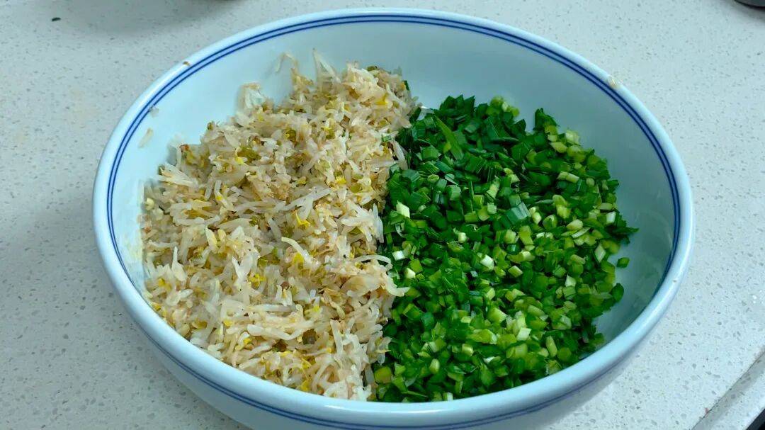 5,韭菜洗净晾干切碎,和绿豆芽放一起,加两圈油搅拌均匀,这样调馅不易出水。