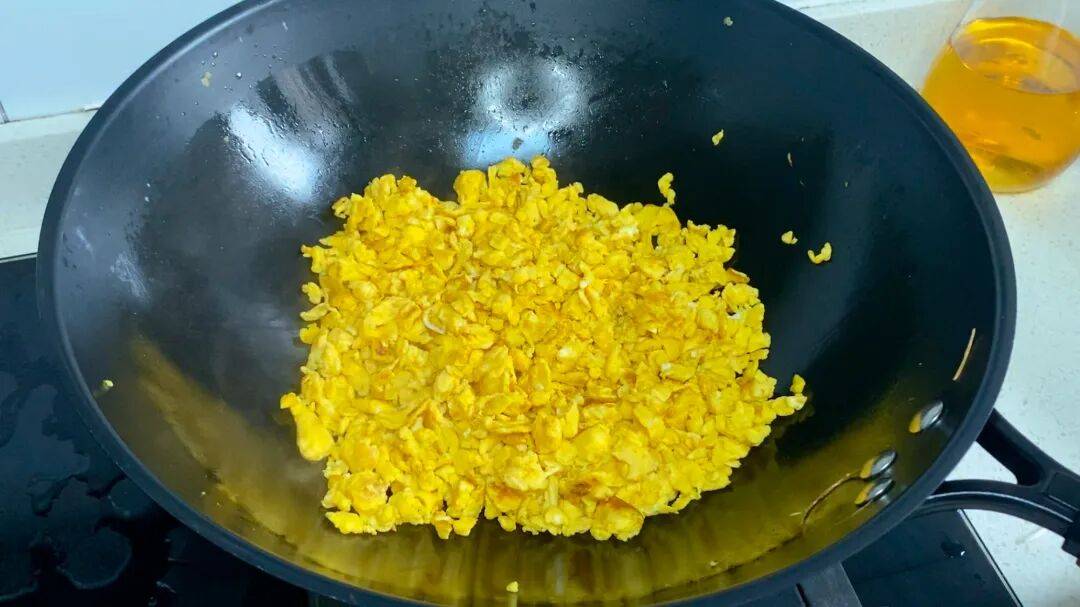 2,炒鸡蛋。锅烧热倒油,油热倒入5个鸡蛋液,快速划散,炒熟后盛出放凉备用。
