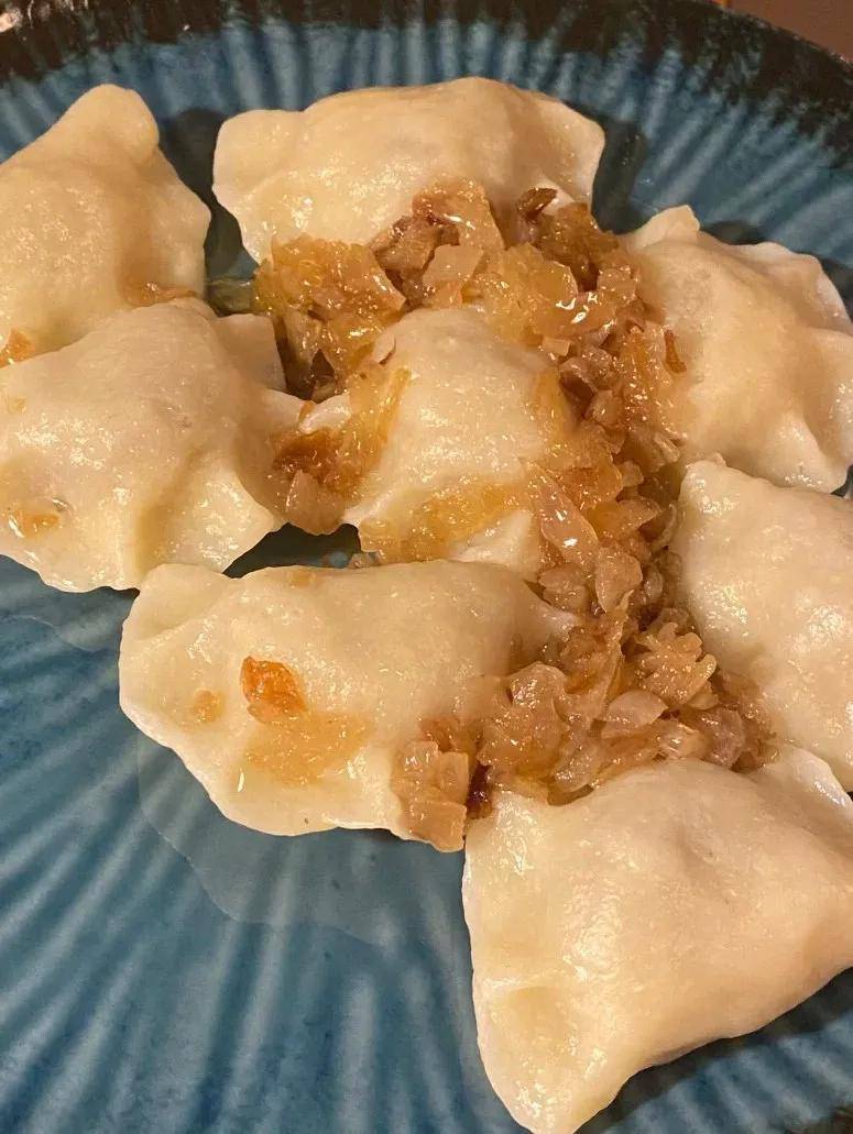 然后包上土豆泥和煎洋葱,最后放在锅里烹煮即可。油炸是另一种传统做法,再配上炸洋葱和酸奶酪一起食用。