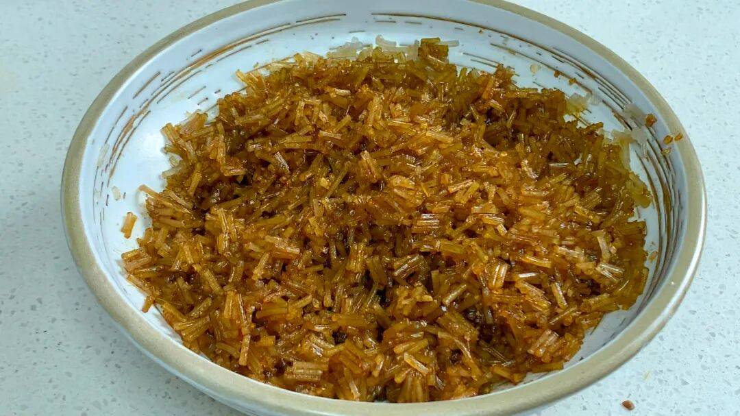 3,半碗粉条碎,加开水浸泡10分钟左右,泡软后沥干水分,加适量老抽搅拌上色备用。