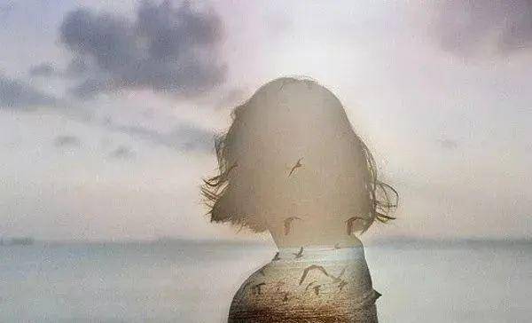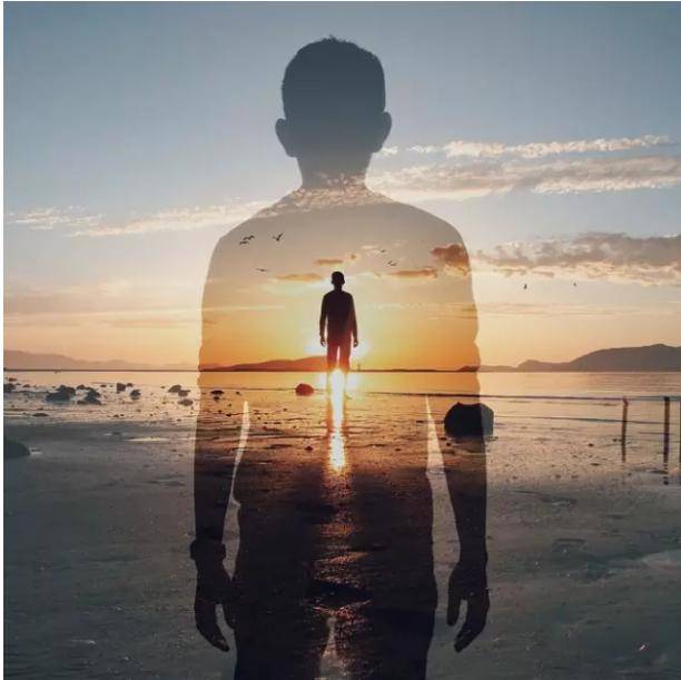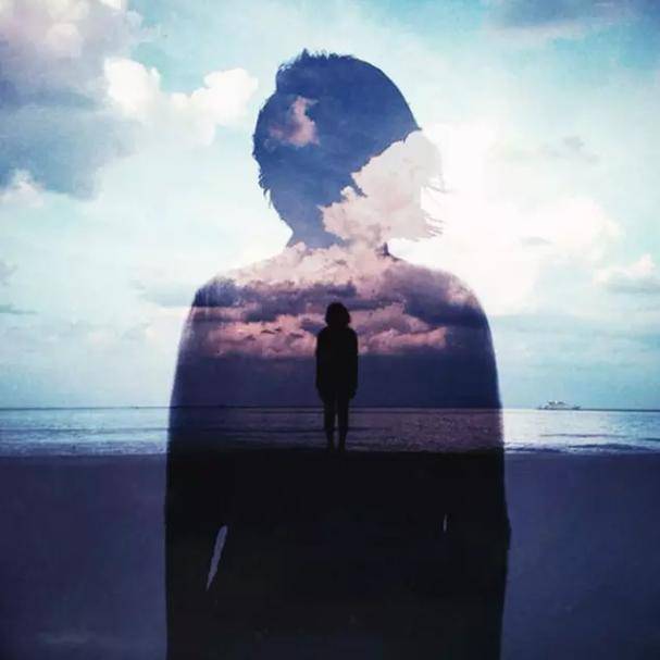 《图片5》:人物剪影中叠加天空、云朵、海面与另一人影
