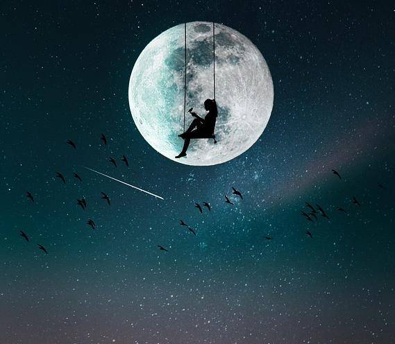《图片7》:一个人坐在秋千上,绳索连着满月,周围飞鸟与流星划过
