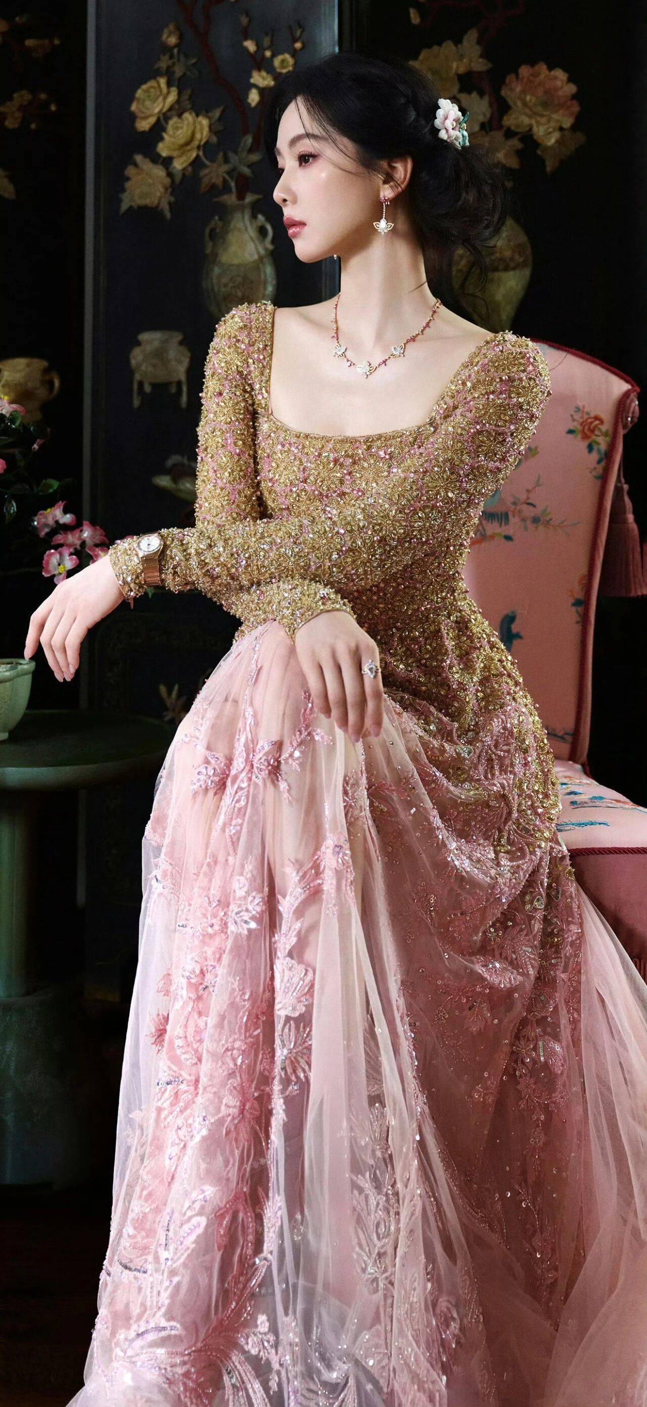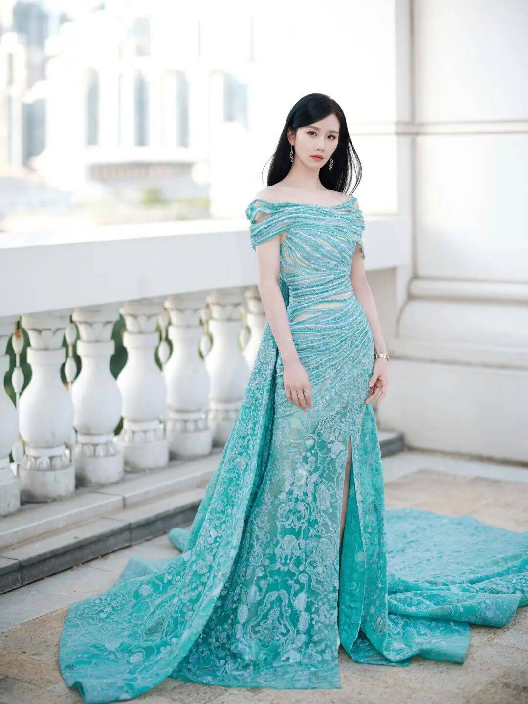 礼裙的设计独具匠心,露肩的款式不仅展现了她的直角肩和优美锁骨,还增添了一份性感与妩媚。裙摆的修身设计则从腰部向下逐渐展开,形成一种优雅的线条感,走动间裙摆摇曳生姿,仿佛自带光芒。裙身上的装饰细节精致无比,钉珠和亮片在灯光下闪烁,如同繁星点点,为整个造型增添了一份华丽与梦幻。