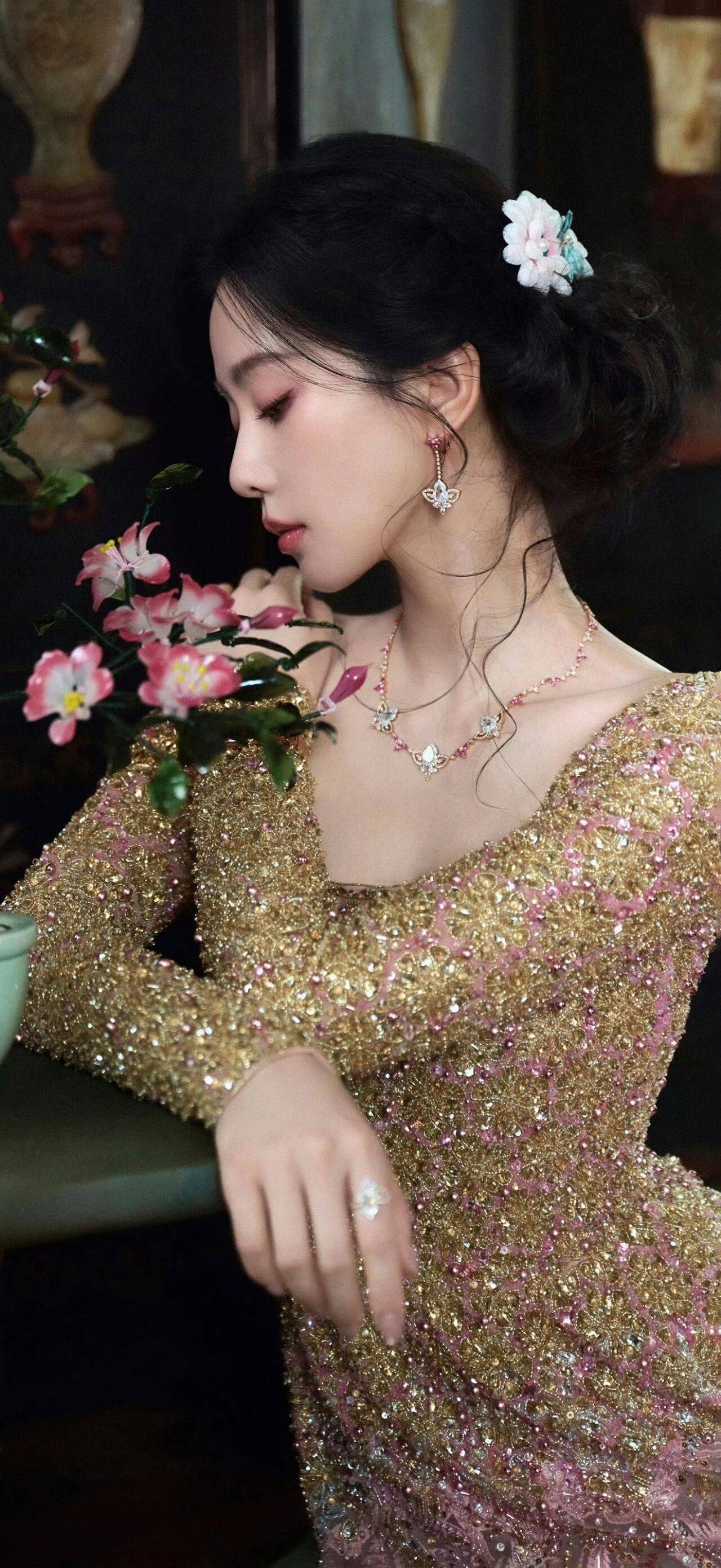 - 五官细节:眉如弯月、眼含秋水,鼻梁线条柔和,唇形小巧精致,不施浓妆也足够惊艳;新中式大片里的旗袍造型,更是把这种清雅推到极致——立领衬出修长脖颈,素腰一束就是黄金比例,乌发玉簪的搭配,活脱脱像从水墨画里走出来的人。