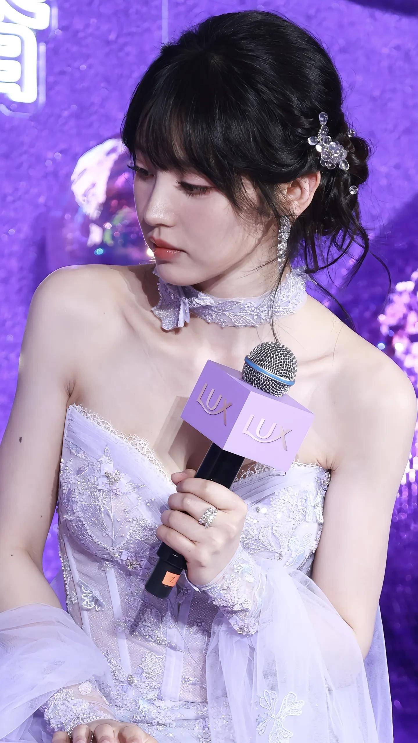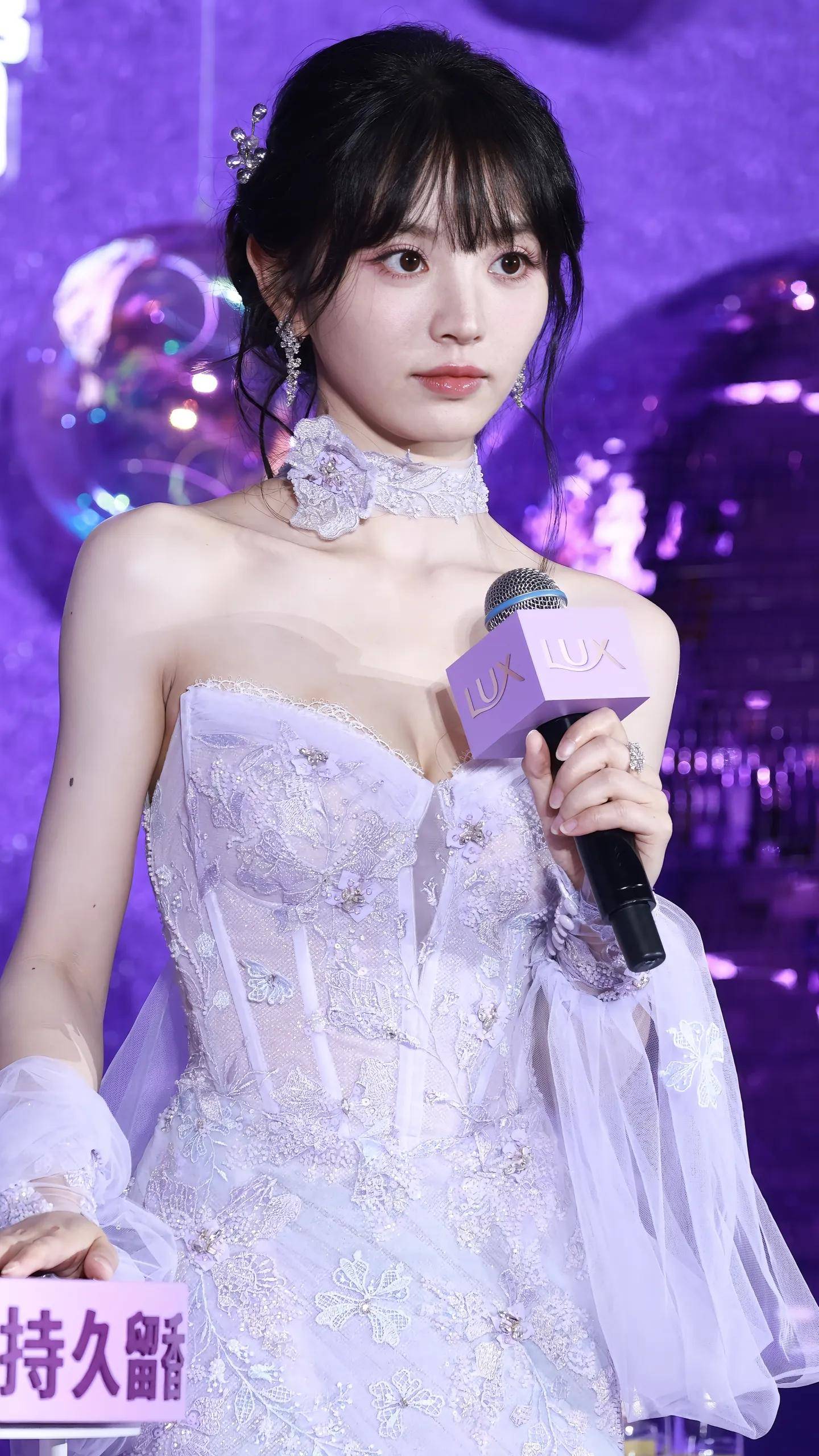 先瞅瞅那件粉紫色抹胸礼服长裙,这颜色选得就超妙。粉紫色,既有着粉色的甜美浪漫,又带着紫色的神秘高贵,两种气质完美融合,就像把梦幻的童话世界穿在了身上。抹胸的设计大胆又吸睛,把田曦薇那精致的锁骨和修长的脖颈毫无保留地展现出来,那线条流畅得就像艺术家精心勾勒的画卷,让人忍不住多看几眼。