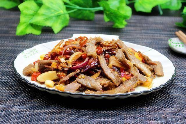 牛肉汆烫后切片,与泡椒等食材快炒。