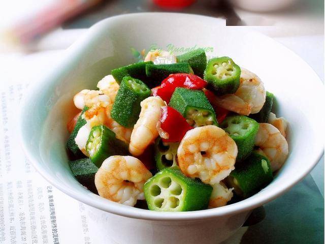 蒜末爆香,放腊肠炒至变色,加入秋葵炒至断生,最后加入虾仁炒至变红。