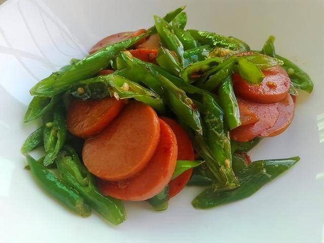 香肠与黄瓜和尖椒翻炒,加盐调味。