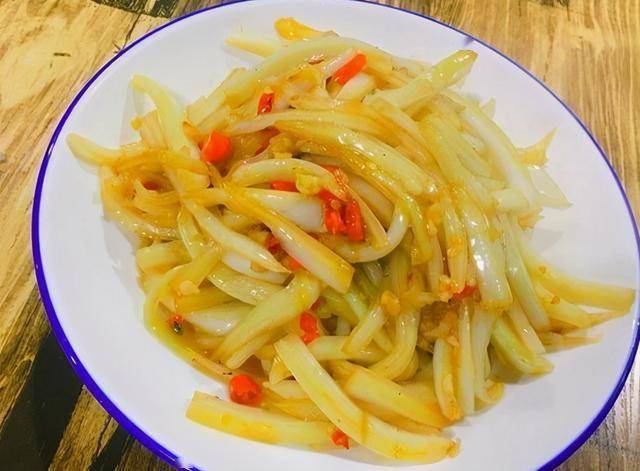 具体步骤:第一步,将白菜去叶后留下硬硬的白菜梗,清洗干净后,切成丝,备用;