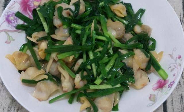 锅中爆香姜丝,加入韭菜翻炒,再加入蚬子肉,加盐调味。