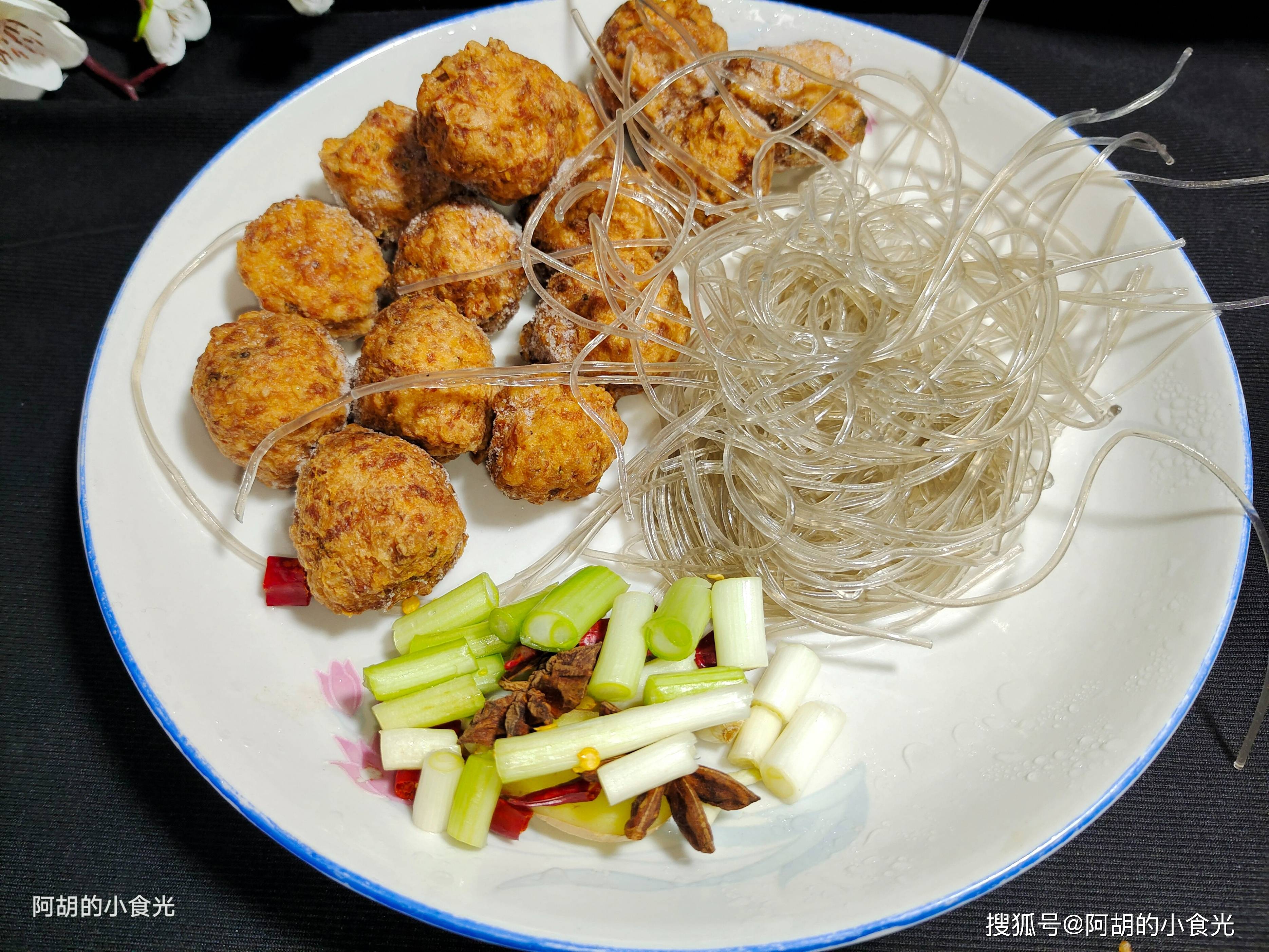 第二步:还有几个油炸肉丸也要备好,油炸的肉丸可以多备一些,平时用冰箱冷冻起来,想吃的时候取出直接下锅炖即可。再来一把干粉条用温水泡软后备用。小料就备一些葱姜蒜和干辣椒,再来两个八角用来提味即可。