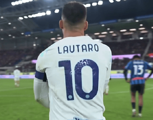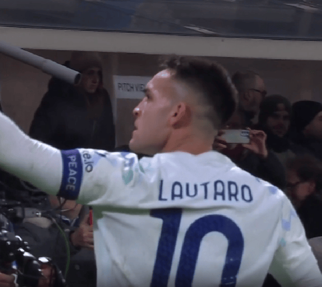 图中身穿白色球衣、背号10、印有“LAUTARO”的球员正是此役制胜英雄。右臂上的“PEACE”袖标象征和平倡议,现场围满摄影师,凸显其巨星地位。
