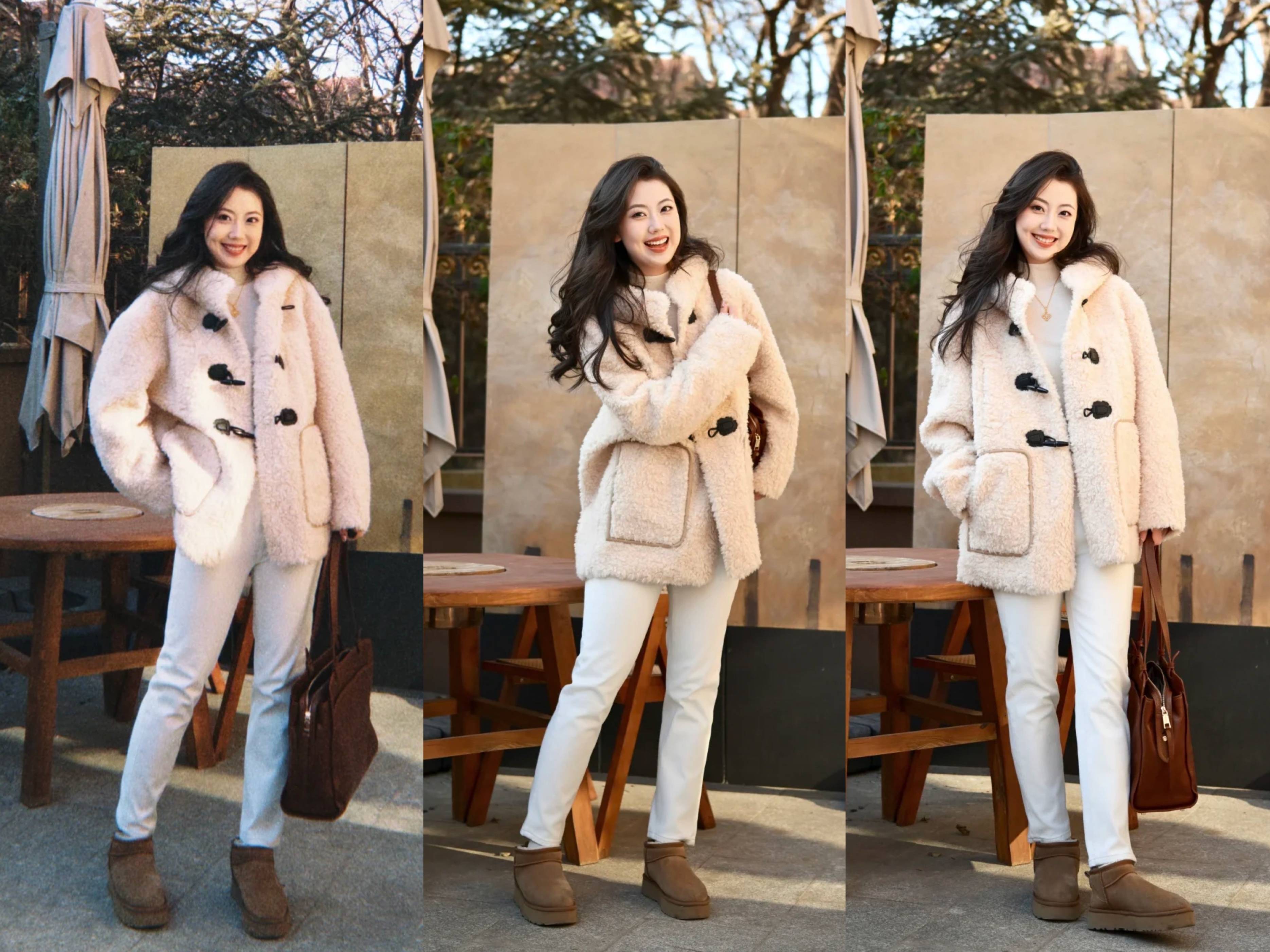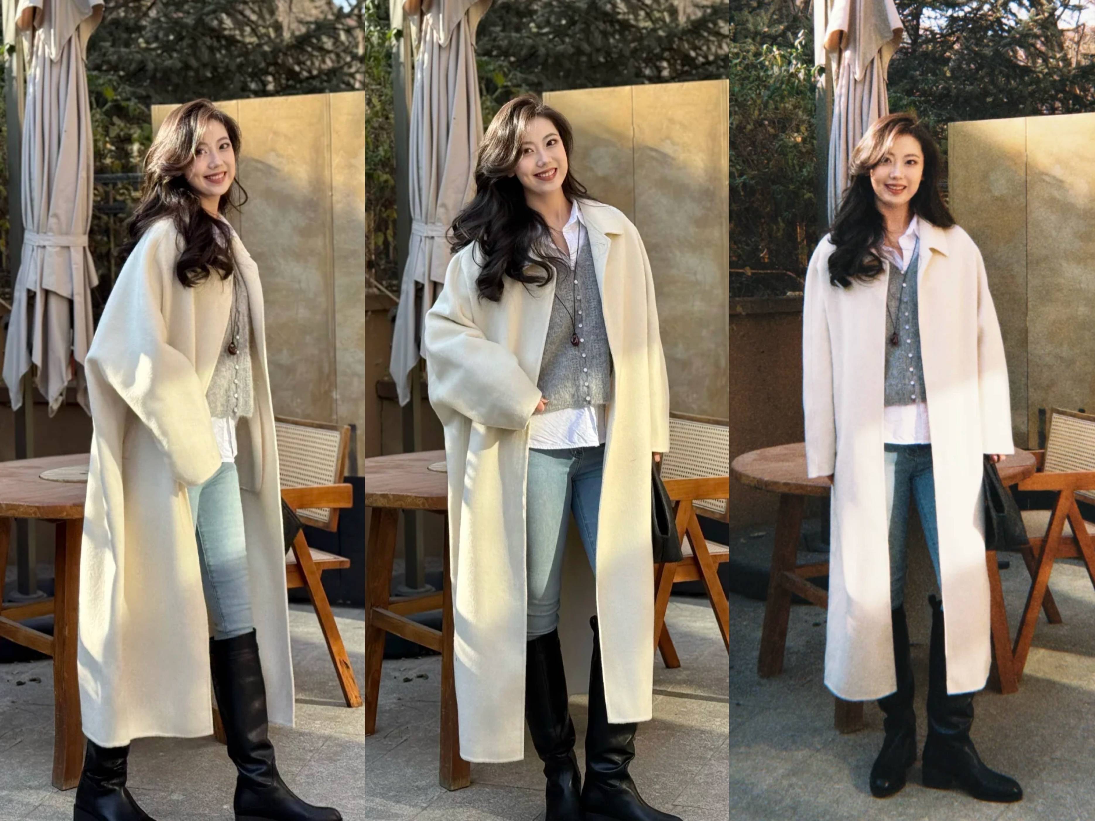 同色系层次: 米白羽绒服+奶油白针织裙,用材质差异营造高级感。