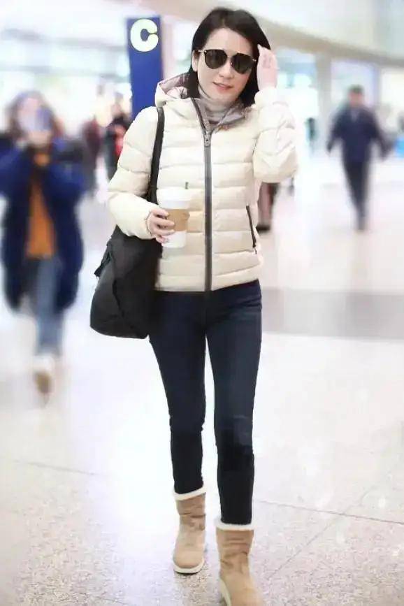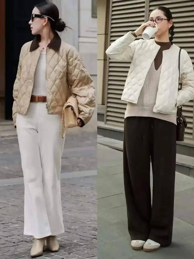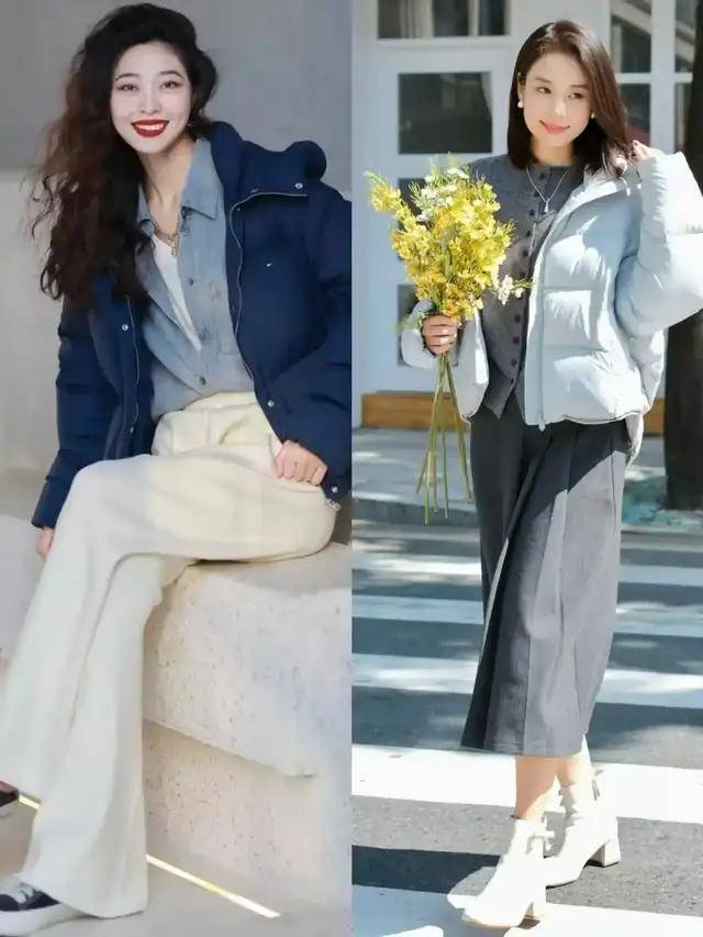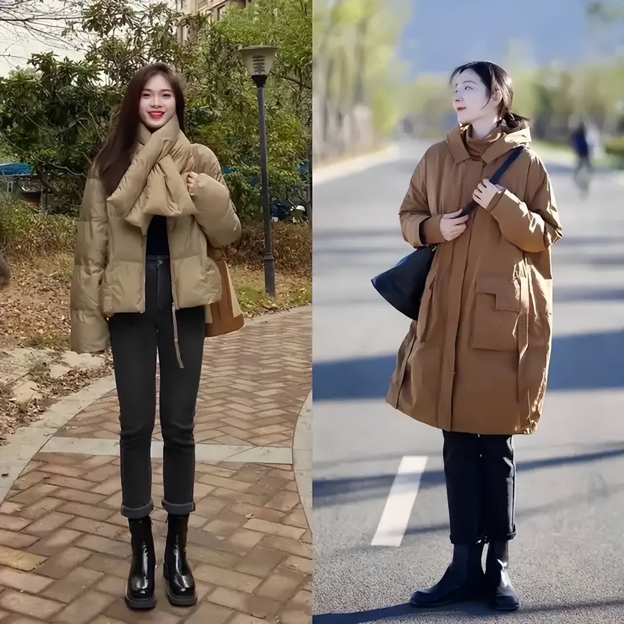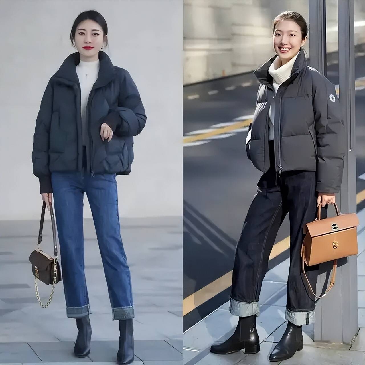 搭配短款羽绒服时,内搭扎进裤子,明确腰线显高挑(如黑色羽绒服+白色直筒裤)。