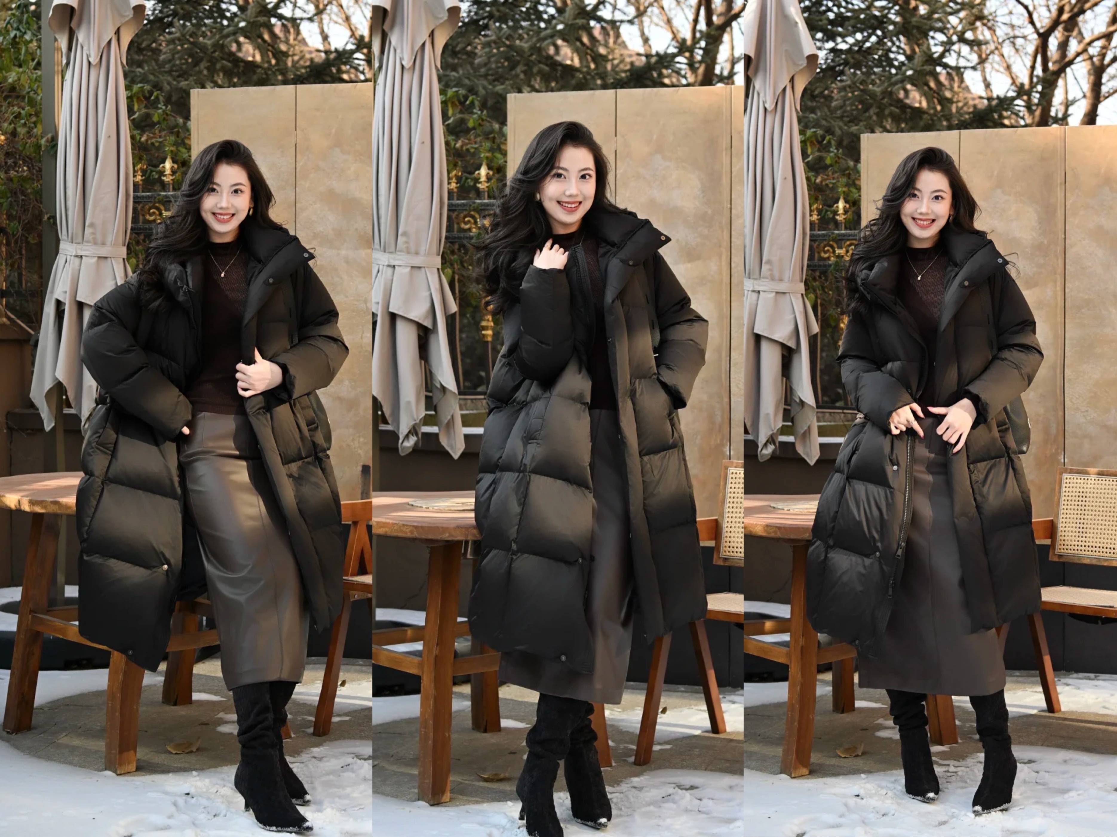 修身针织长裙外搭宽松羽绒服,"内紧外松"凸显曲线,搭配踝靴优雅通勤。