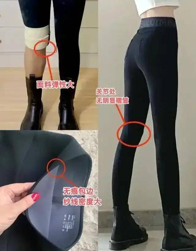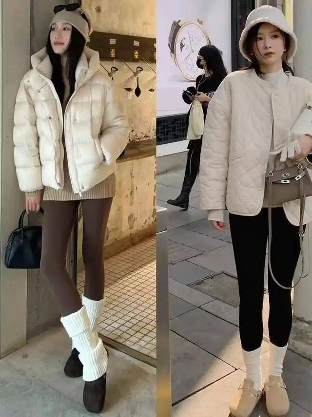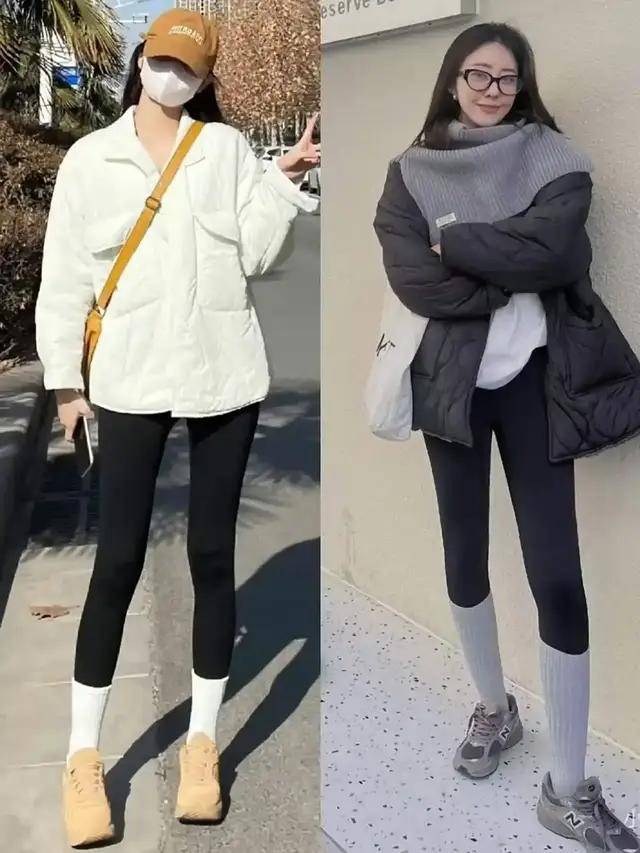 蓬松羽绒服(尤其长款)搭配黑色鲨鱼裤或加绒紧身裤,平衡上半身量感,突出纤细腿部。