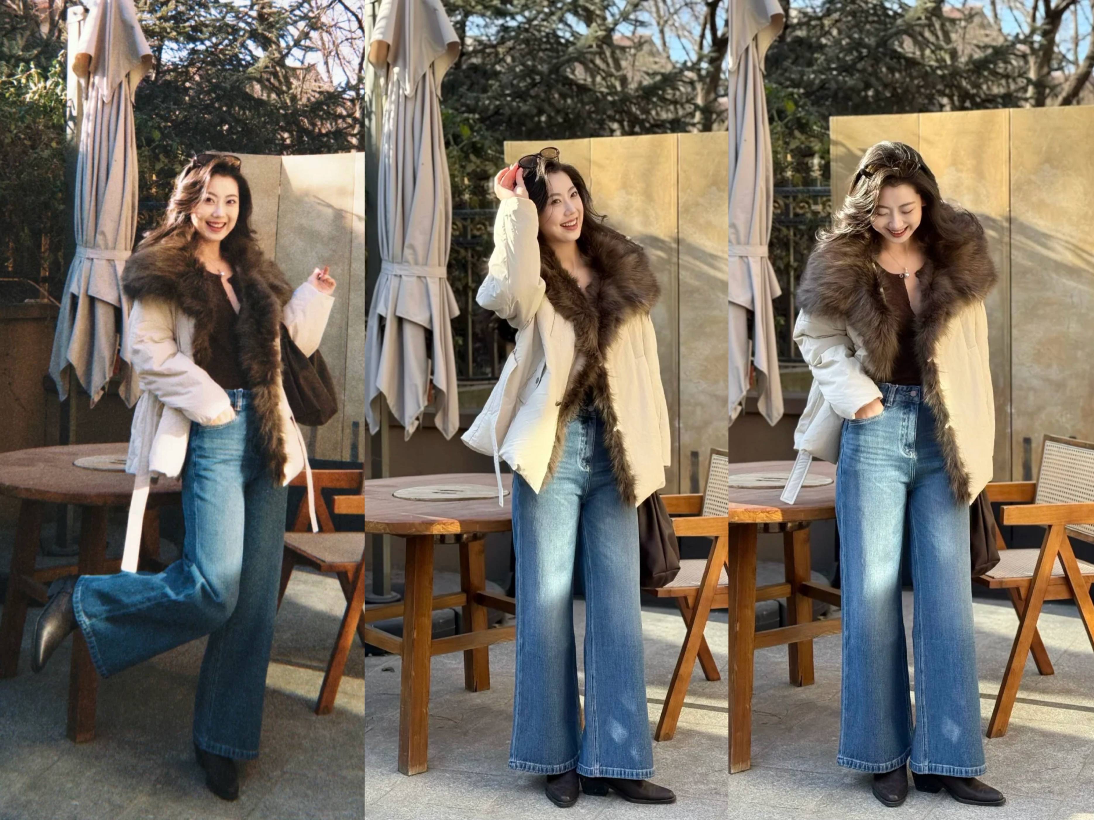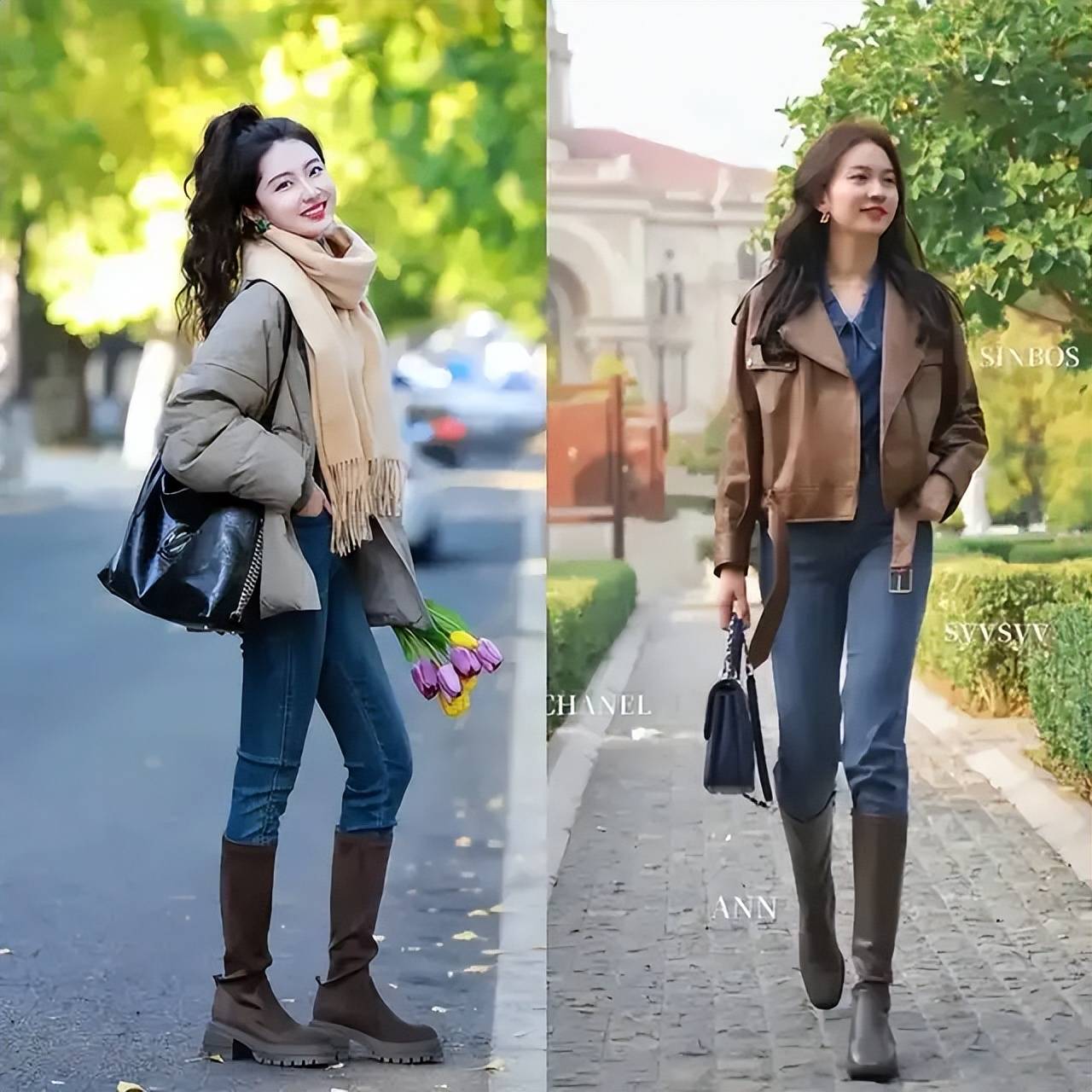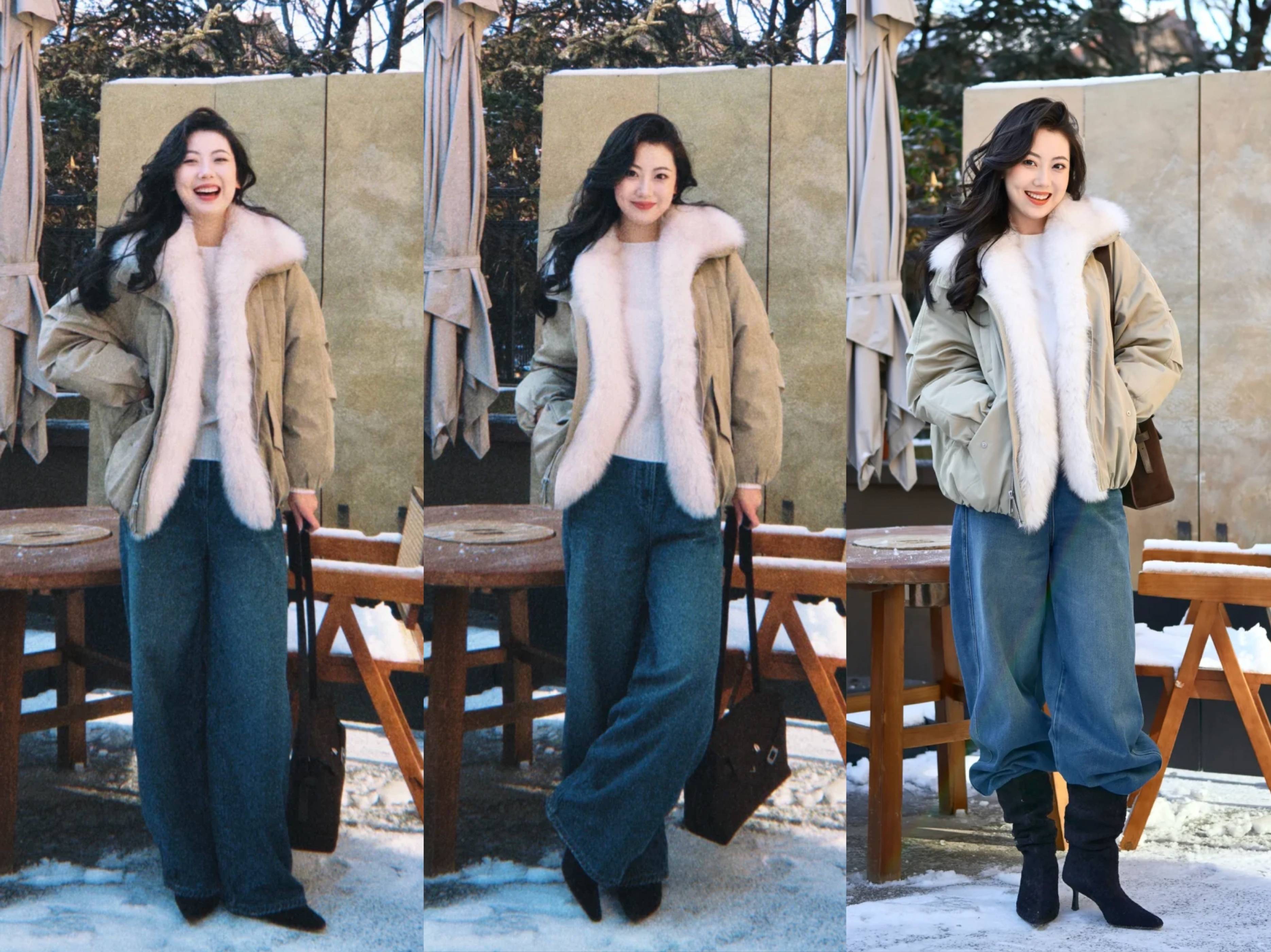 面料首选牛仔、灯芯绒或加厚针织,搭配收口设计防灌风(如羽绒服+牛仔阔腿裤+短靴)。