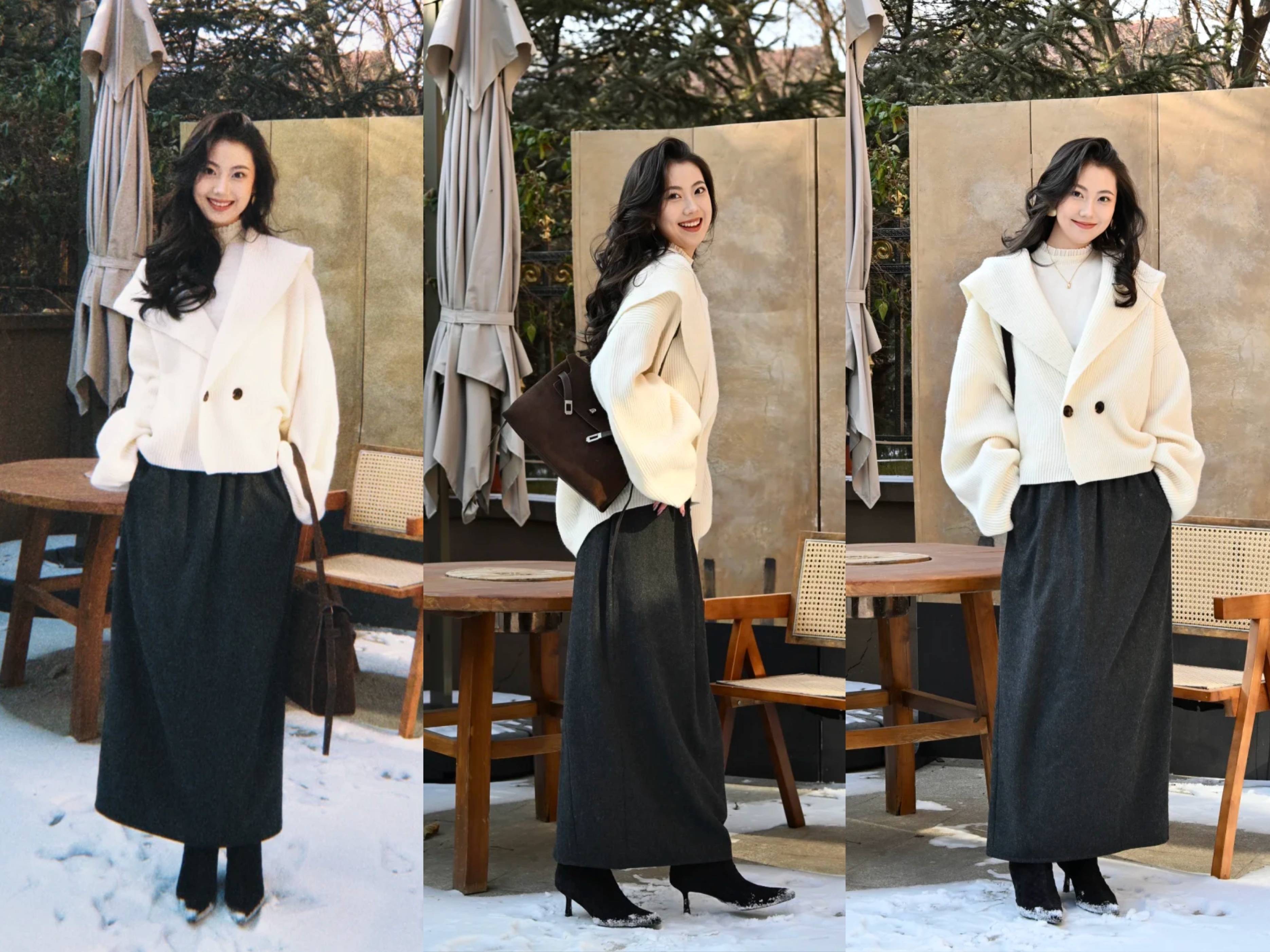 高腰A字裙(毛呢、针织材质)遮住腰腹赘肉,搭配短款羽绒服打造"上短下长"比例。