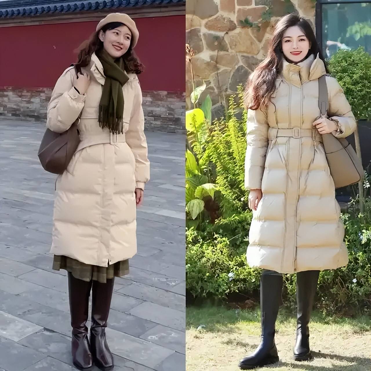 浅色羽绒服配深色裙子(如杏色+墨绿),显白又高级。