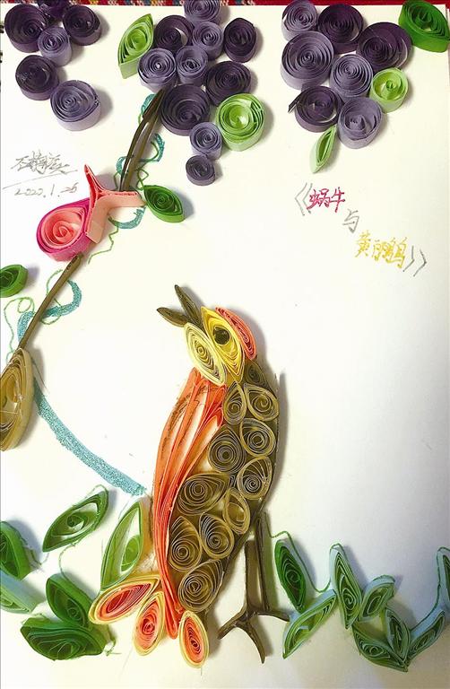 用深紫、浅紫和青色纸条卷成紧密不一、大小不同的圆形,形状简单,数量很多,费了我不少工夫。把它们贴在画面顶部。此后就简单了,只要做细细的葡萄架和翠绿的小草,让蜗牛趴在葡萄架上面。经过一上午的努力,一幅风景画完成了。图中的黄鹂鸟好像在对蜗牛唱歌,又好像在诉说着什么……