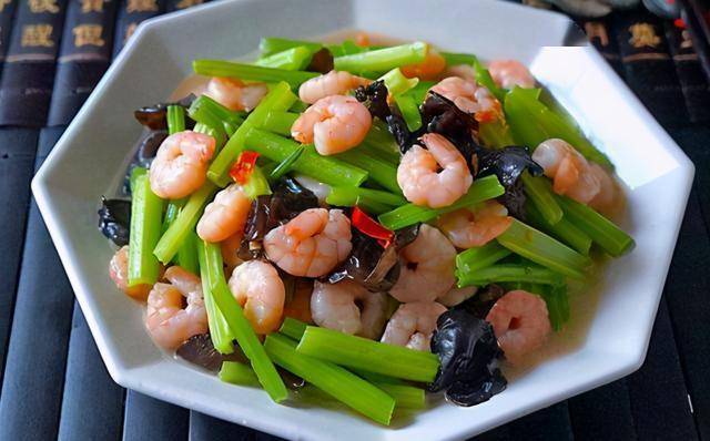 材料:芹菜200克、虾仁240克、黑木耳50克、小米椒2个、生姜丝3克、盐适量、淀粉少许、料酒几滴