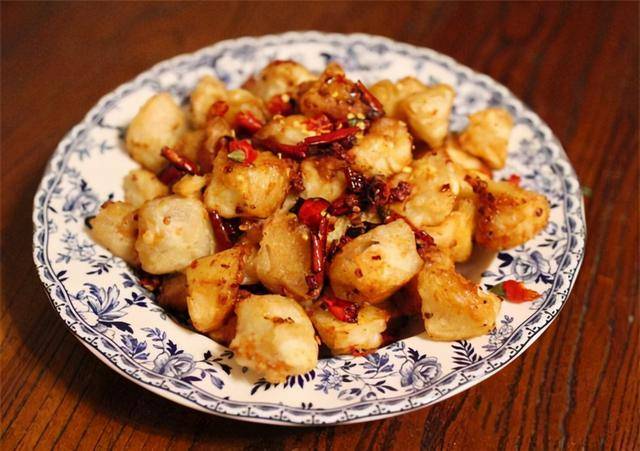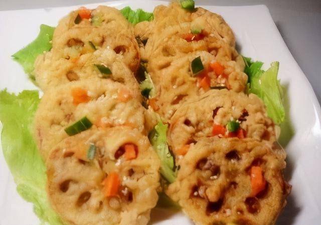 7、炸至表面凝固呈淡黄色捞出,清除面尾。再烧热油锅,将藕夹重炸焦酥,呈金黄色时滤出油,洒入花椒粉,淋入香油炒匀即可。