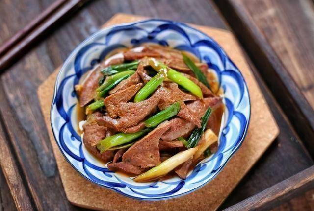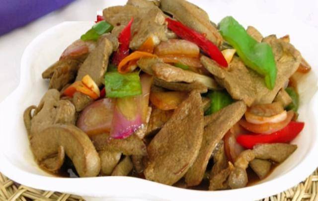 3、锅置火上,倒植物油烧热,炒香洋葱丝、姜丝,再放入猪肝片、盐,改大火翻炒至熟。
