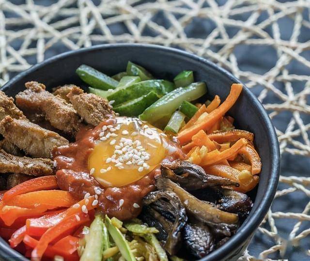 5、在石锅内壁涂上香油,放入熟米饭,再将炒好各种蔬菜丝和牛肉碎平铺码在饭上,把煎至单面熟的荷包蛋放中心。石锅用小火加热,当听到米饭发出滋滋的声音便可关火,此时锅底的米饭会形成微黄的锅巴