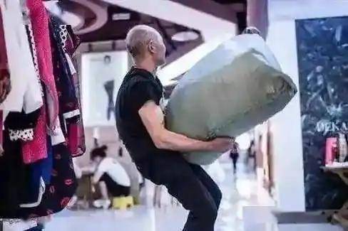 图片7:一名头发稀少男子正搬运一个较大的灰绿色物体 → 动作吃力,身体前倾,核心稳定性差。