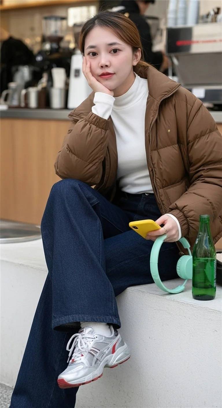 郑秀晶的另一套也很值得借鉴,New Balance的浅灰短款羽绒服+阔腿牛仔裤,是经典的韩系休闲搭配,蹲姿的随性摆拍也让造型更有街头感。
