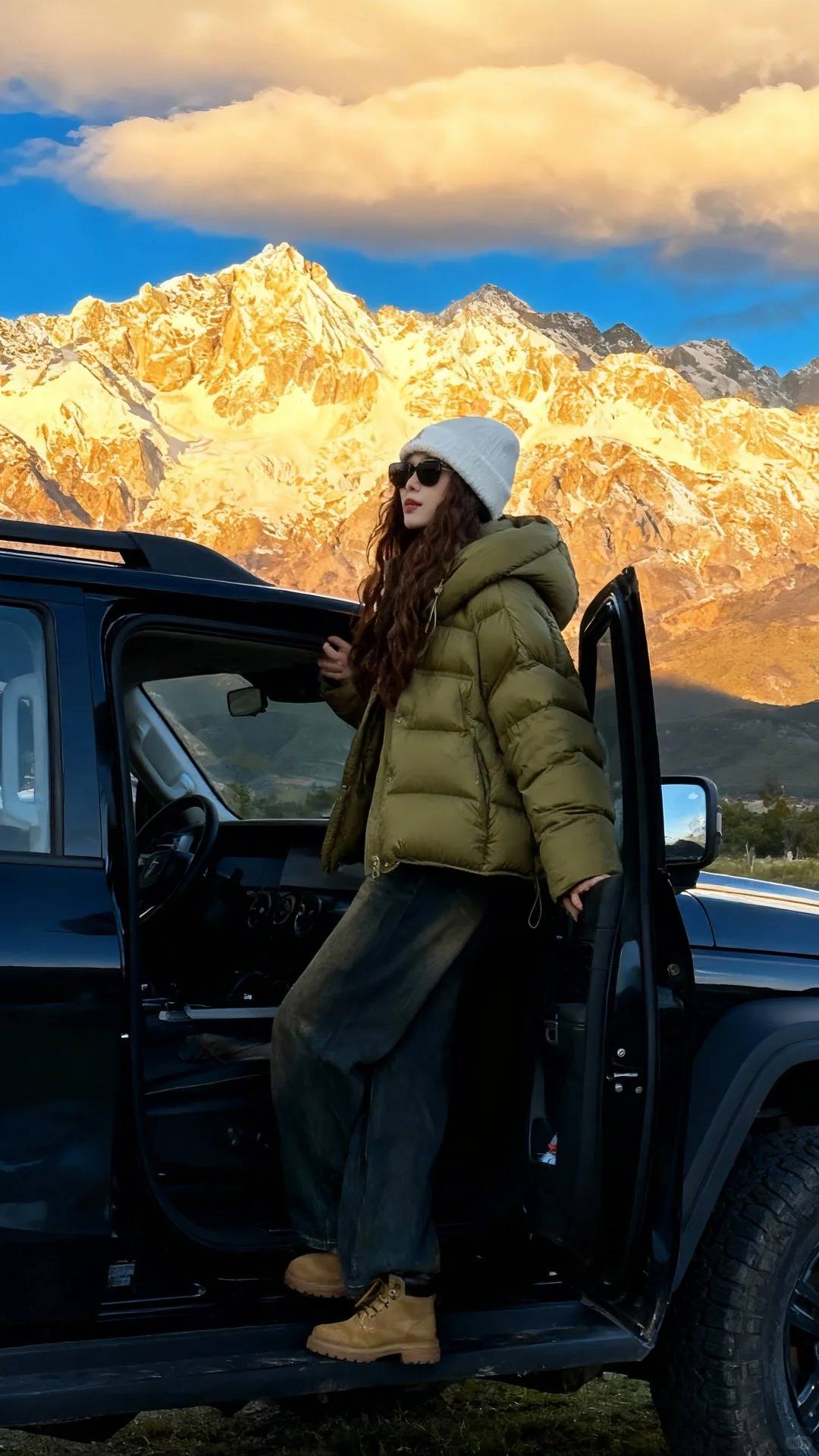 杨采钰示范冬日雪场穿搭,凯乐石的浅湖蓝羽绒服搭配黑色滑雪裤,清爽又有运动活力,滑雪镜+针织帽的专业配饰叠戴,精准拿捏滑雪场景的氛围感,同色系的高领内搭和羽绒服无缝衔接,视觉上拉长颈部线条。