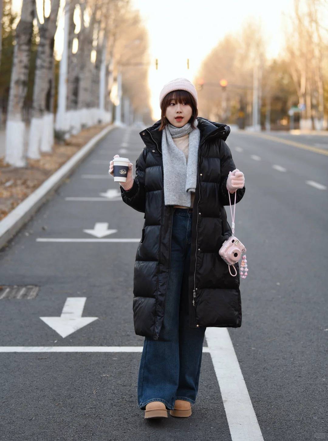 技巧:黑白撞色打破单调,宽松裤型+短款羽绒服兼顾保暖与利落;换高跟鞋可秒变轻熟风。