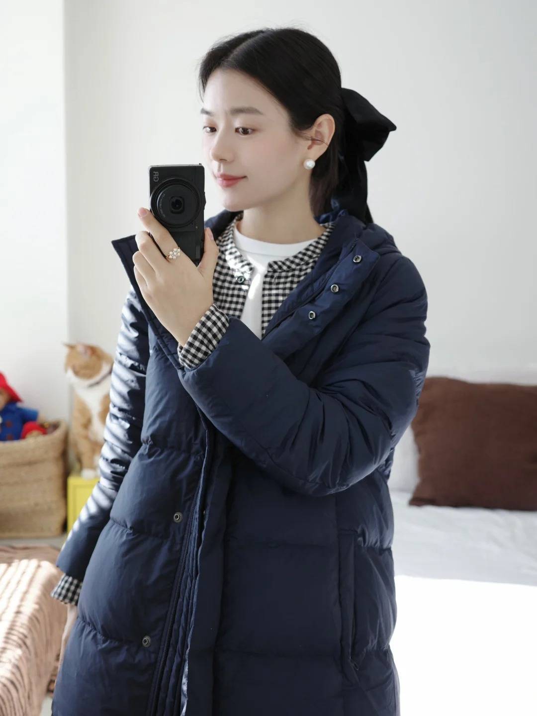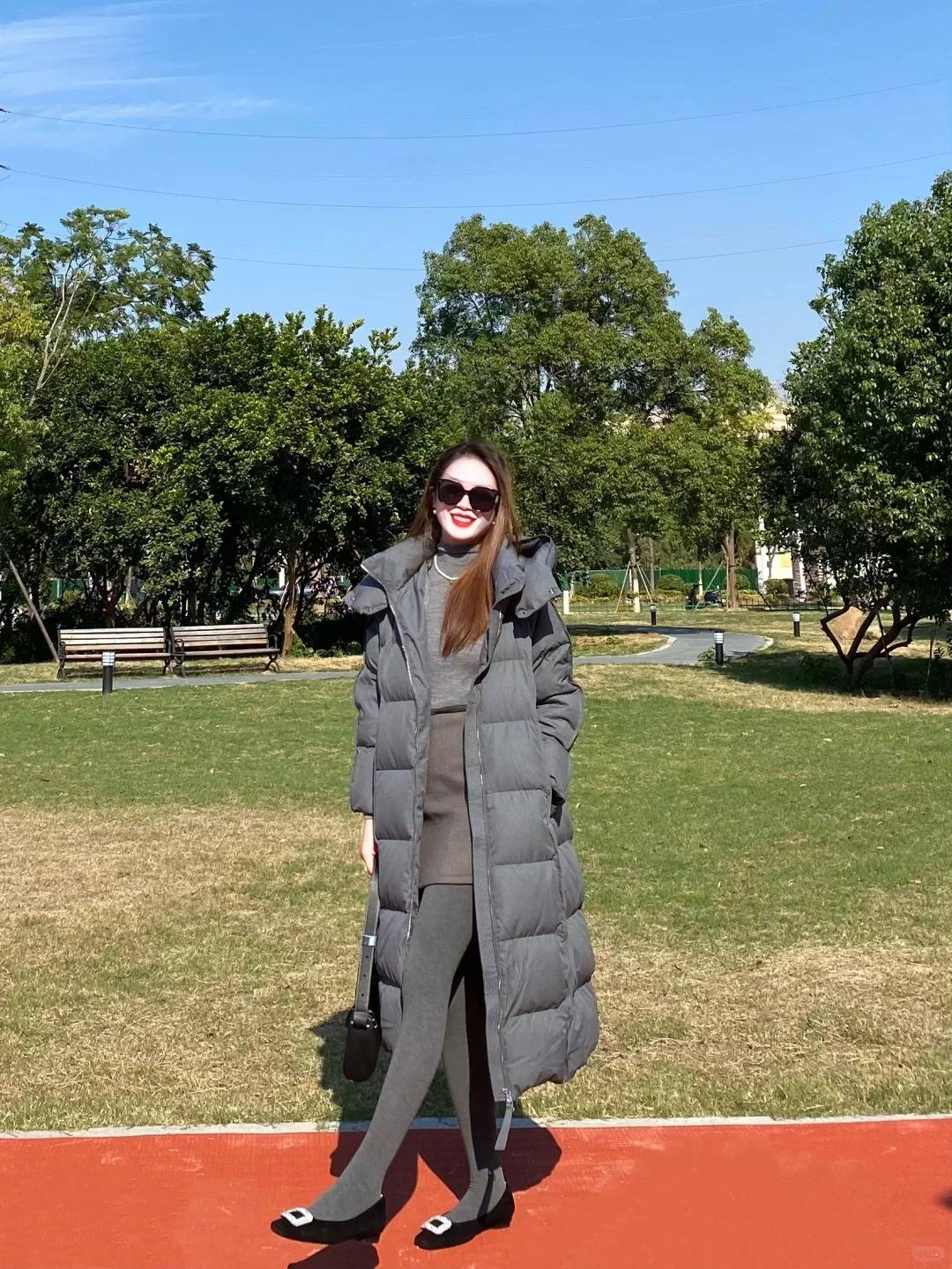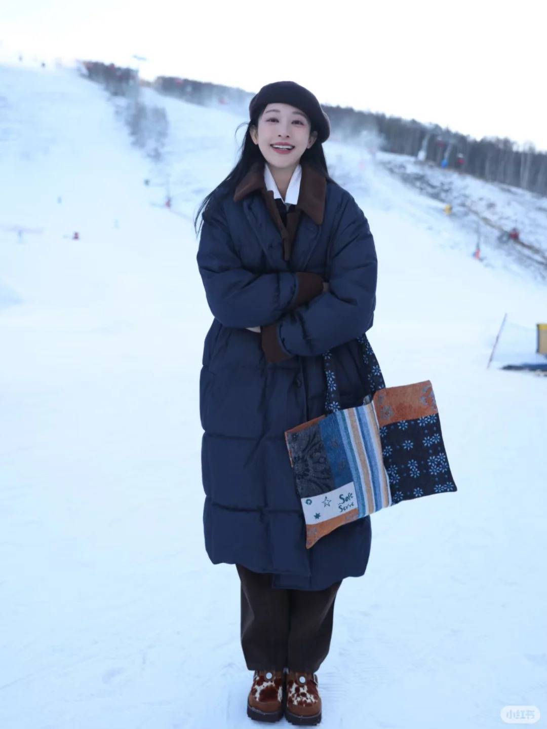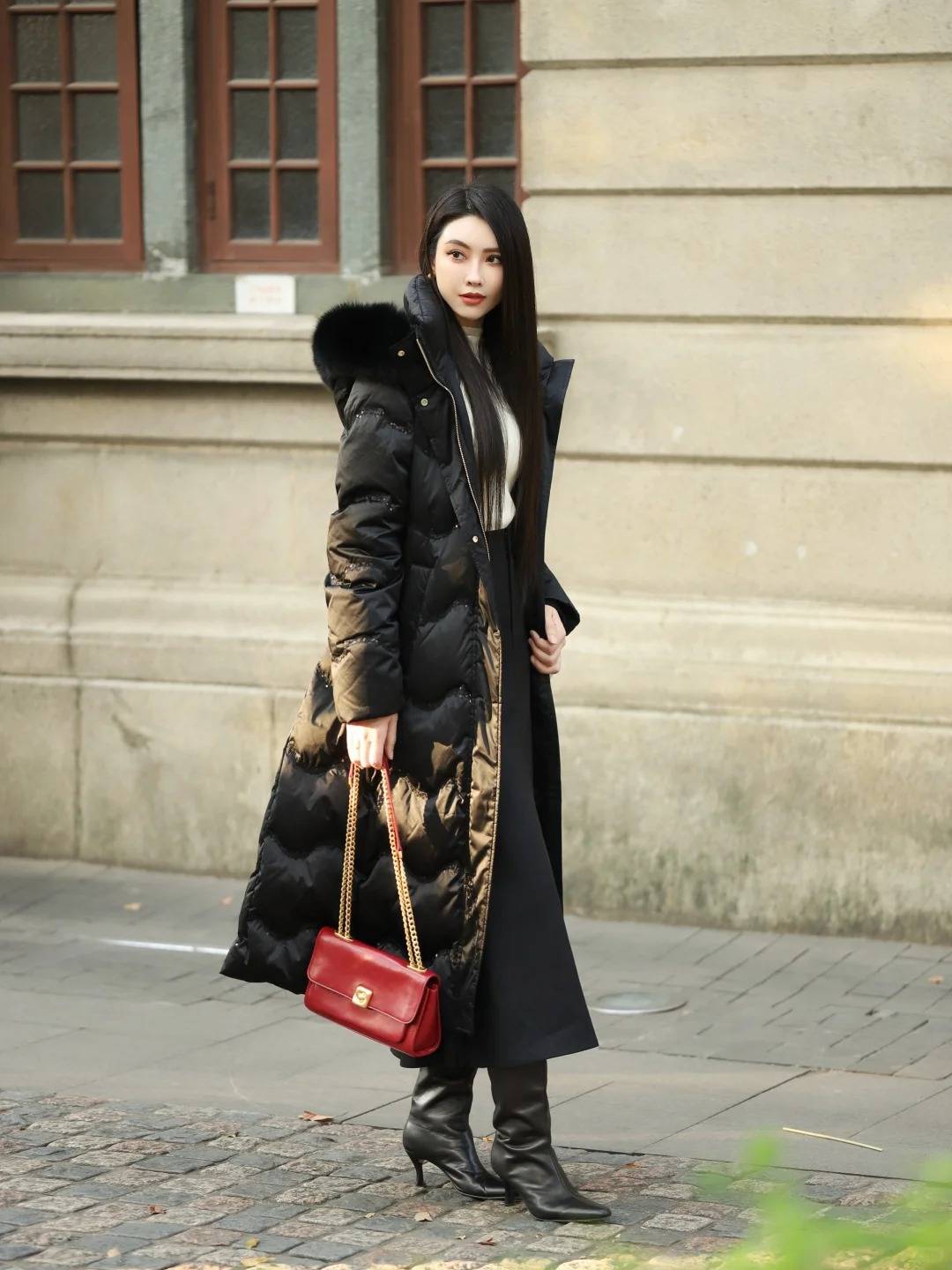 技巧:收腰设计避开臃肿雷区,羽绒服穿出“连衣裙”优雅感;白色手提包增加精致度。