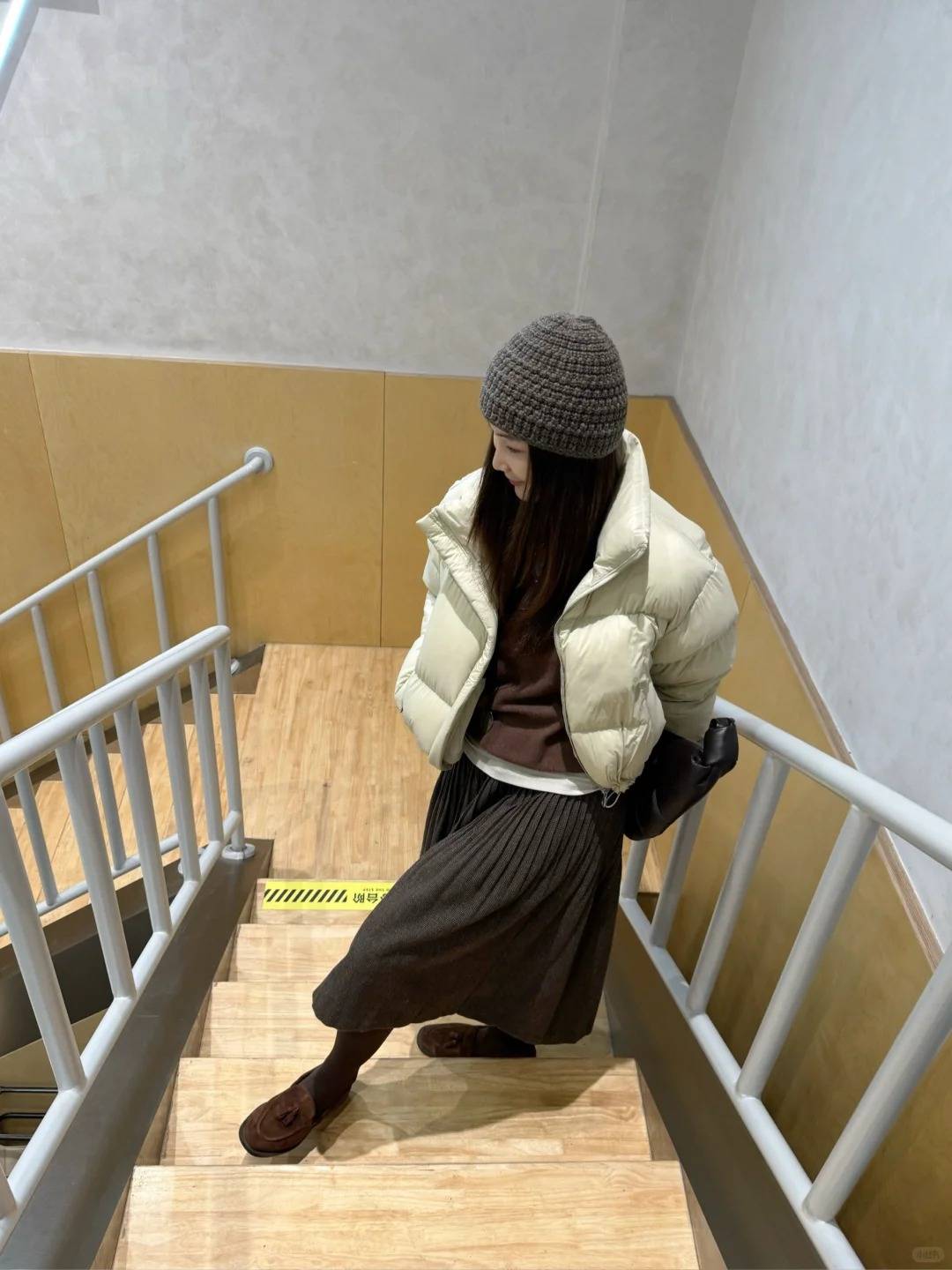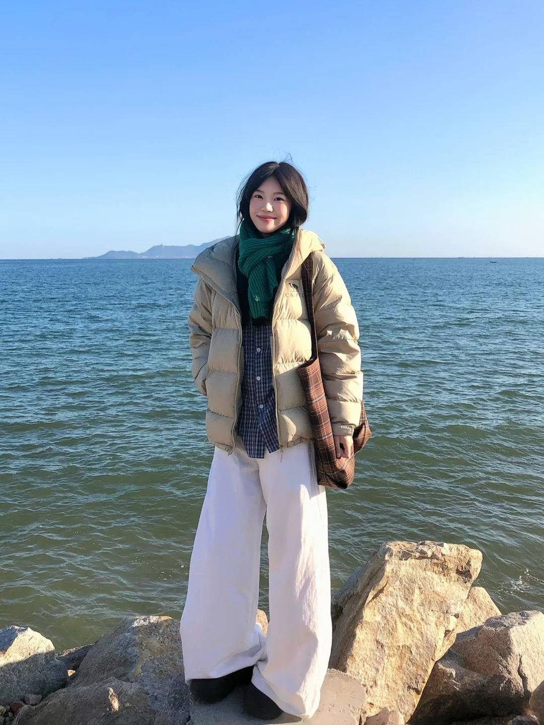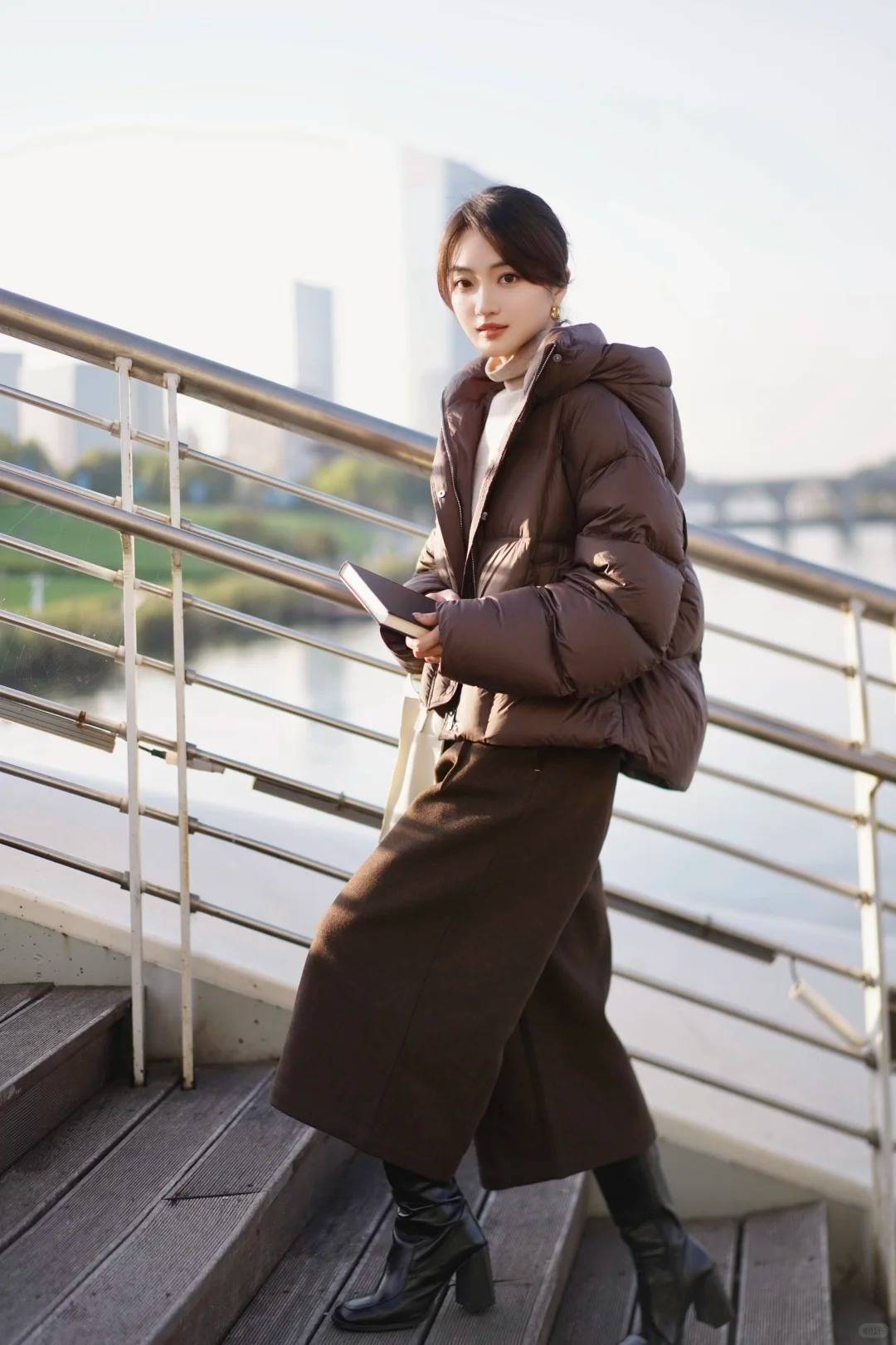 日常通勤:短款羽绒服+阔腿裤+乐福鞋(舒适又利落);