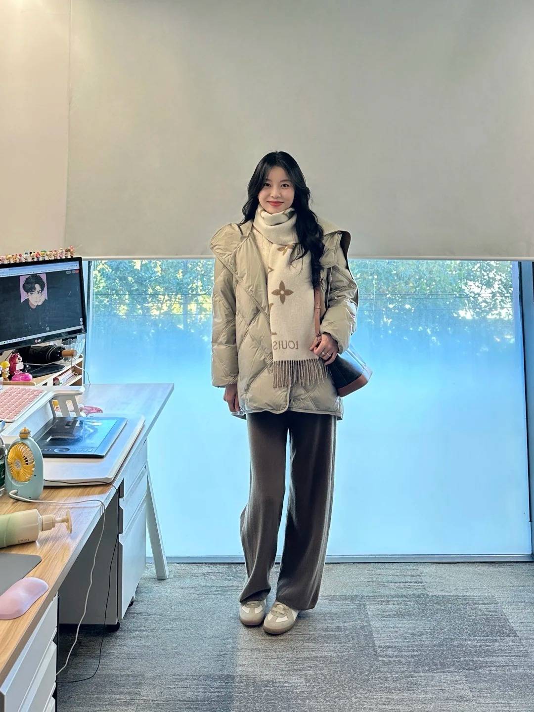 吴千语身穿Marius白黑撞色羽绒服搭配卡其阔腿裤,走的是干练中性风,把羽绒服穿出了“男友风”的随性帅气。这套也很适合打工人日常通勤,宽松裤型+短款羽绒服的组合,兼顾保暖和利落,换双高跟鞋还能秒变轻熟风。