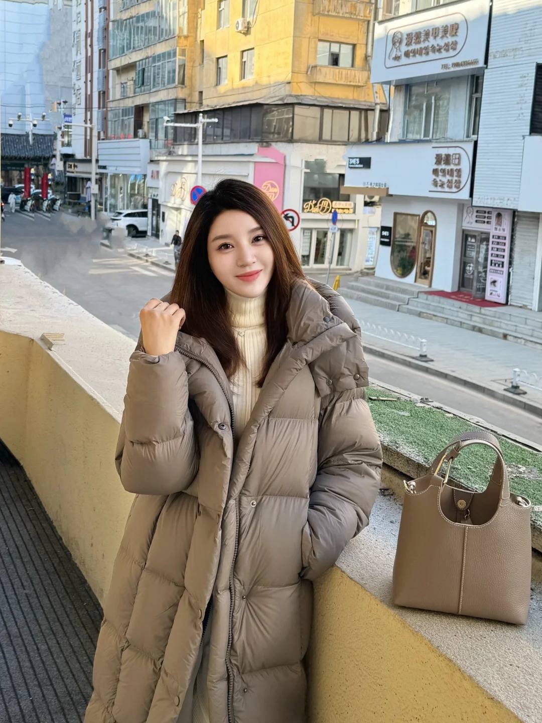 凸显腰线,完全避开了羽绒服的臃肿雷区;白色手提包的搭配增加了精致度。