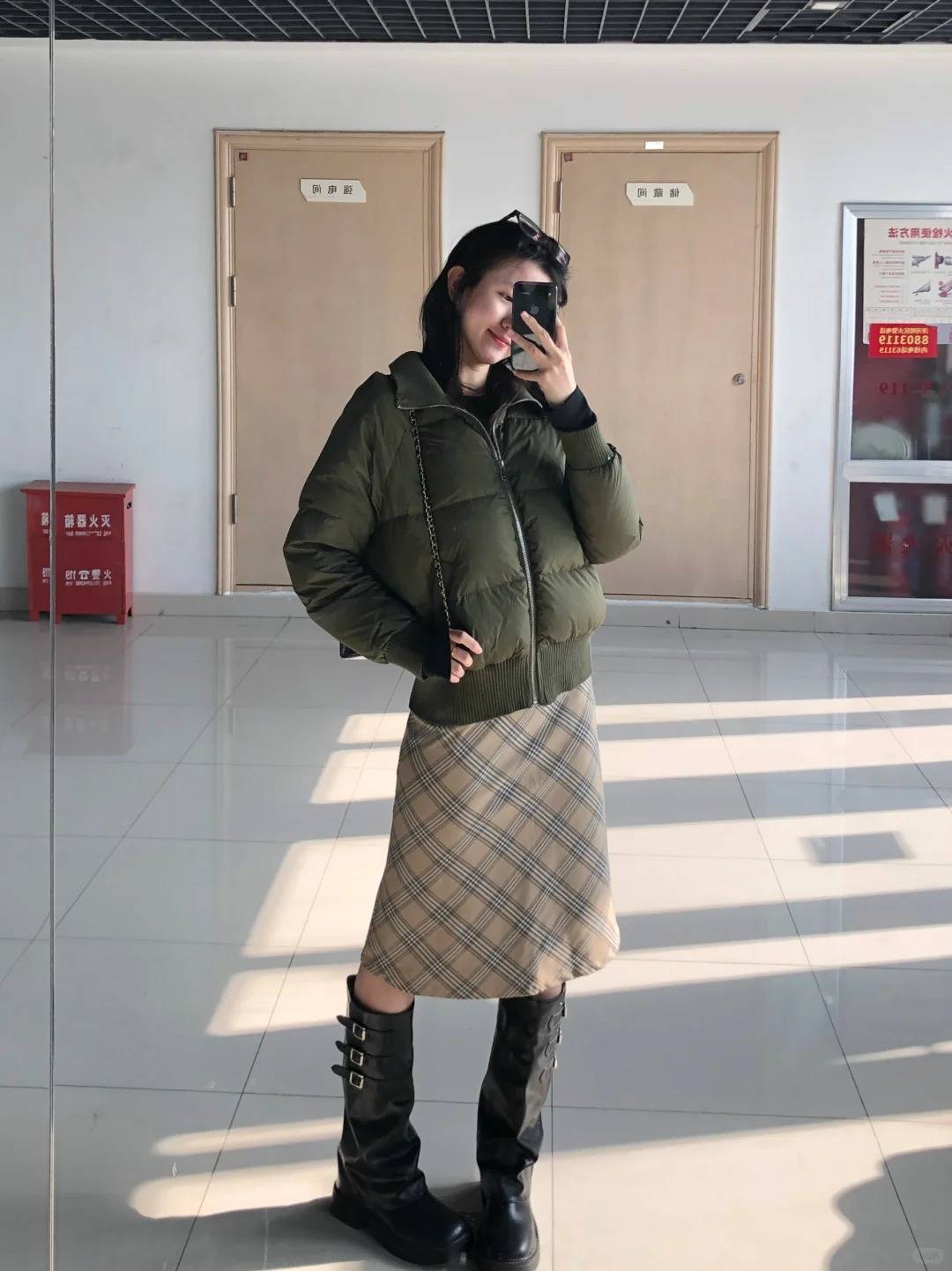 冬日想要甜美一点,可以选择张婧仪这种收腰花苞感羽绒服,Burberry羽绒服搭配黑色紧身裤、过膝长靴,是冬日“又美又暖”的穿搭模板,把羽绒服穿出了“连衣裙”的优雅感。