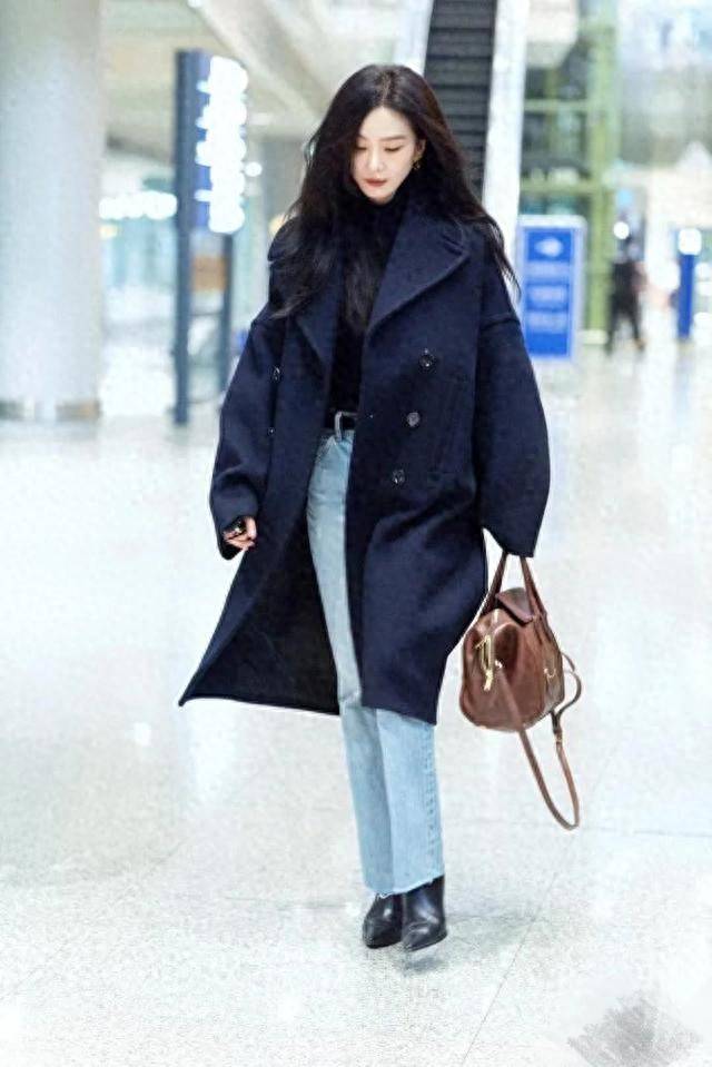 刘诗诗选择深蓝色CELINE垂感大衣,内搭黑色高领衫,浅蓝色牛仔裤,黑色短靴,手持红棕色包包。